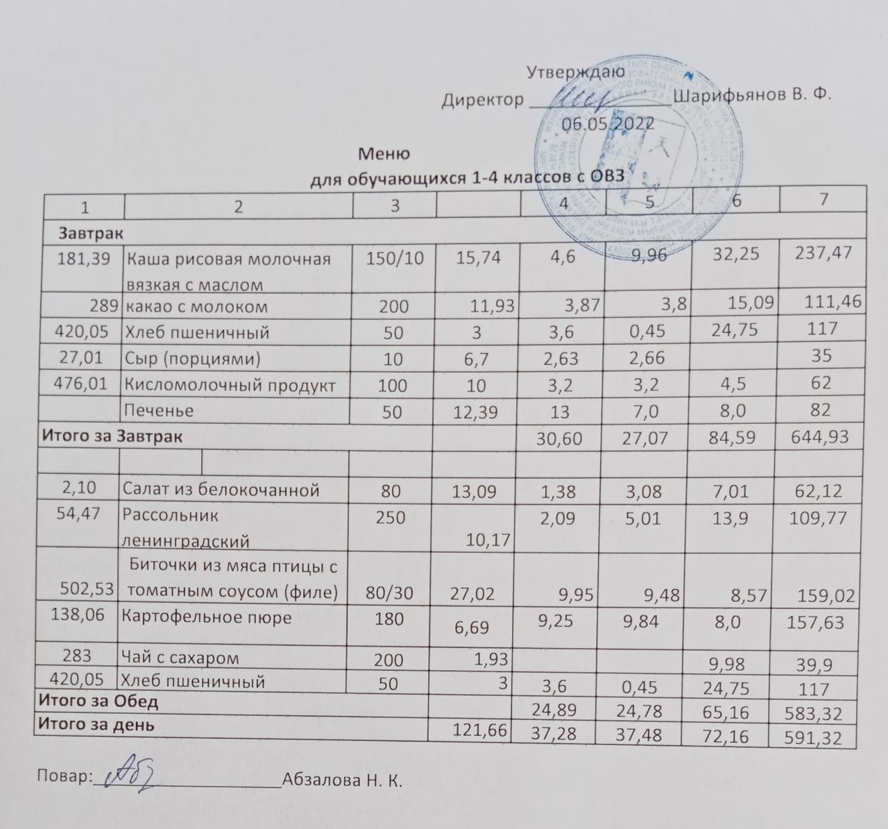 Меню на 06.05. для учащихся 1-4 кл с ОВЗ