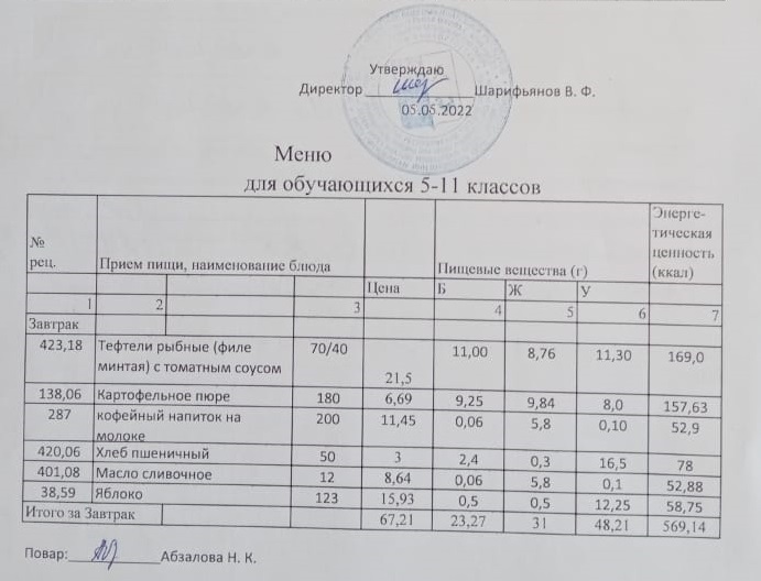 Меню на 05.05. для учащихся 5-11 кл