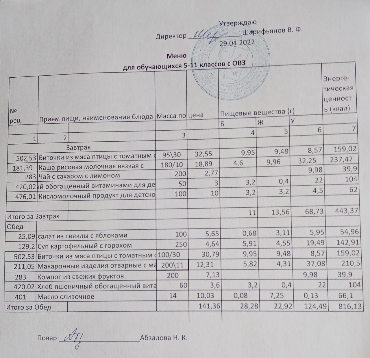 Меню на 29.04. для учащихся 5-11 кл с ОВЗ