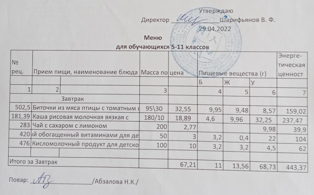 Меню на 29.04. для учащихся 5-11 кл