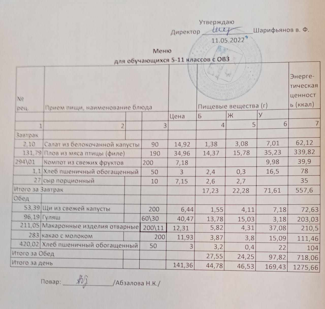 Меню на 11.05. для учащихся 5-11 кл с ОВЗ