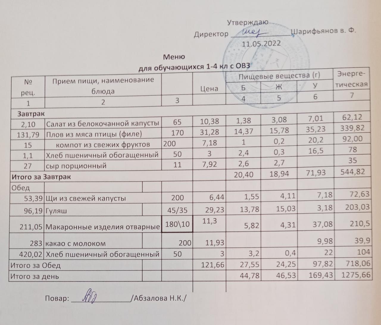 Меню на 11.05. для учащихся 1-4 кл с ОВЗ