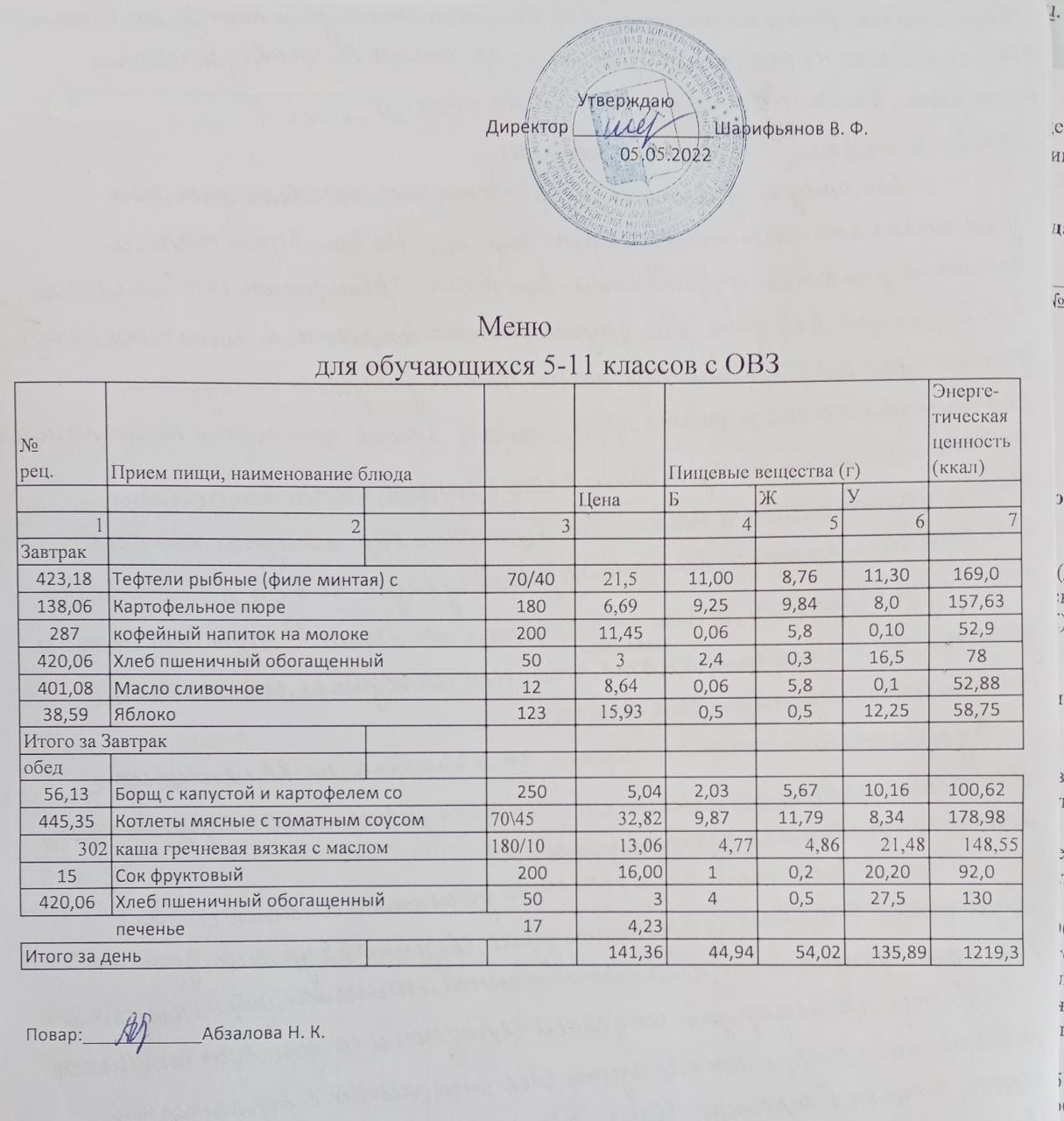 Меню на 05.05. для учащихся 5-11 кл с ОВЗ