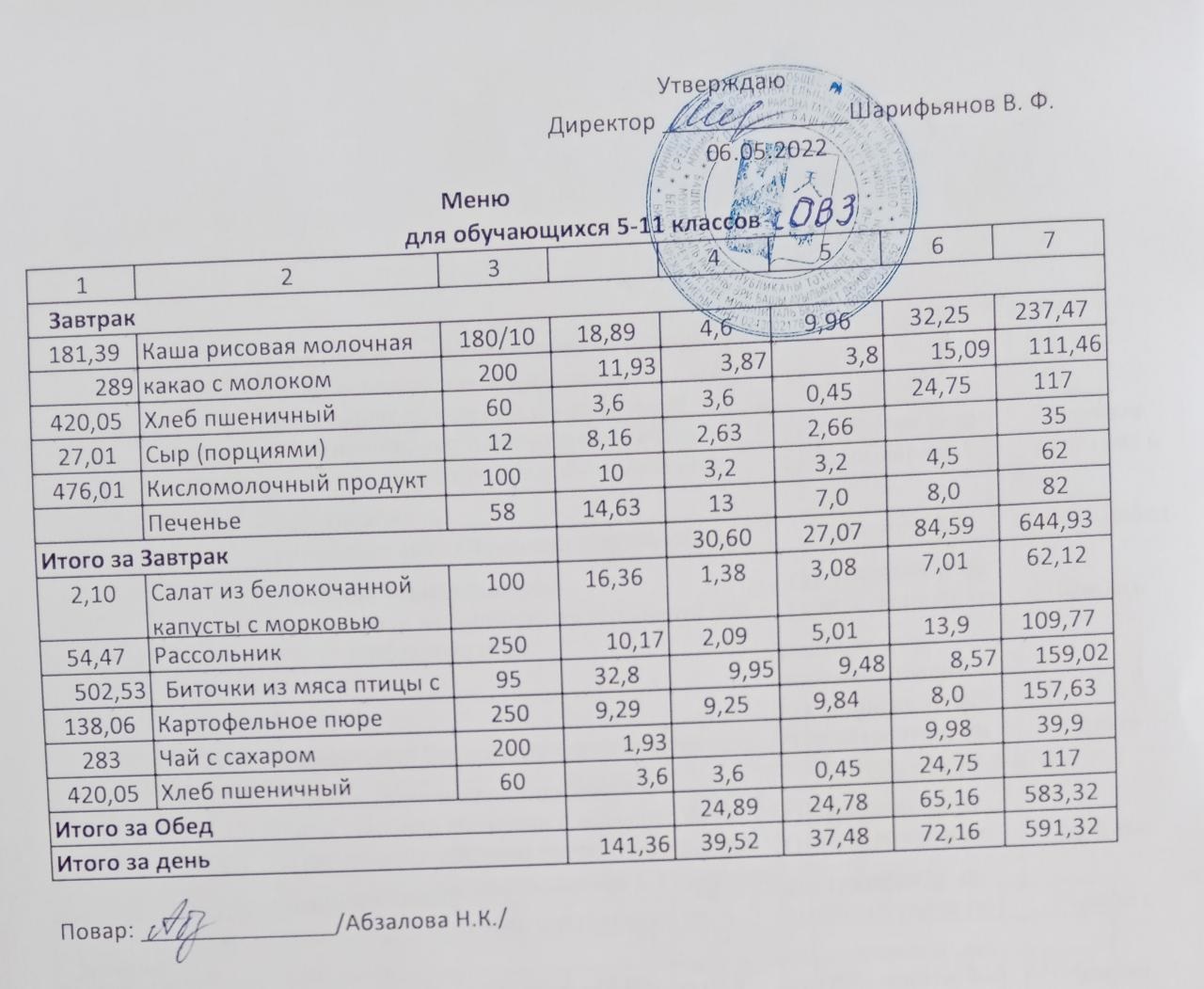 Меню на 06.05. для учащихся 5-11 кл