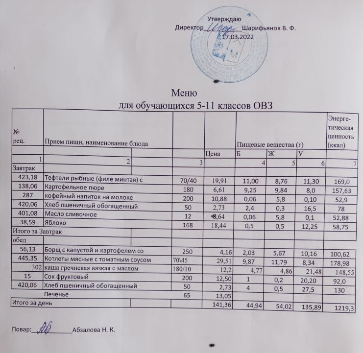 Меню на 17.03. для учащихся 5-11 кл с ОВЗ