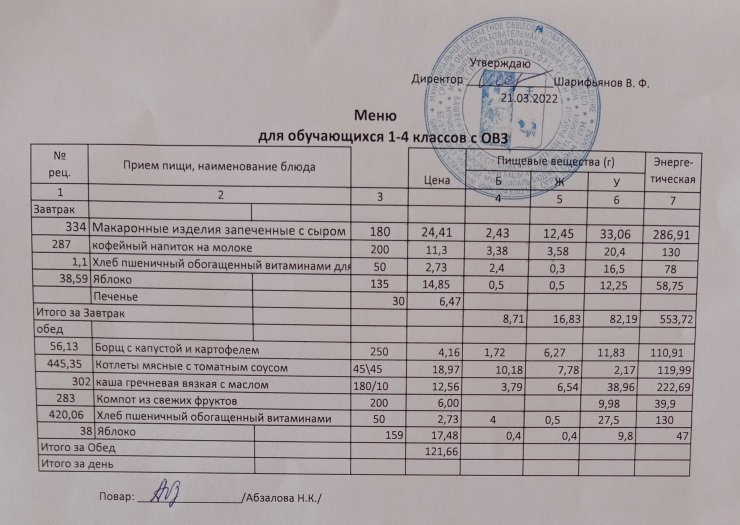 Меню на 21.03. для учащихся 1-4 кл с ОВЗ