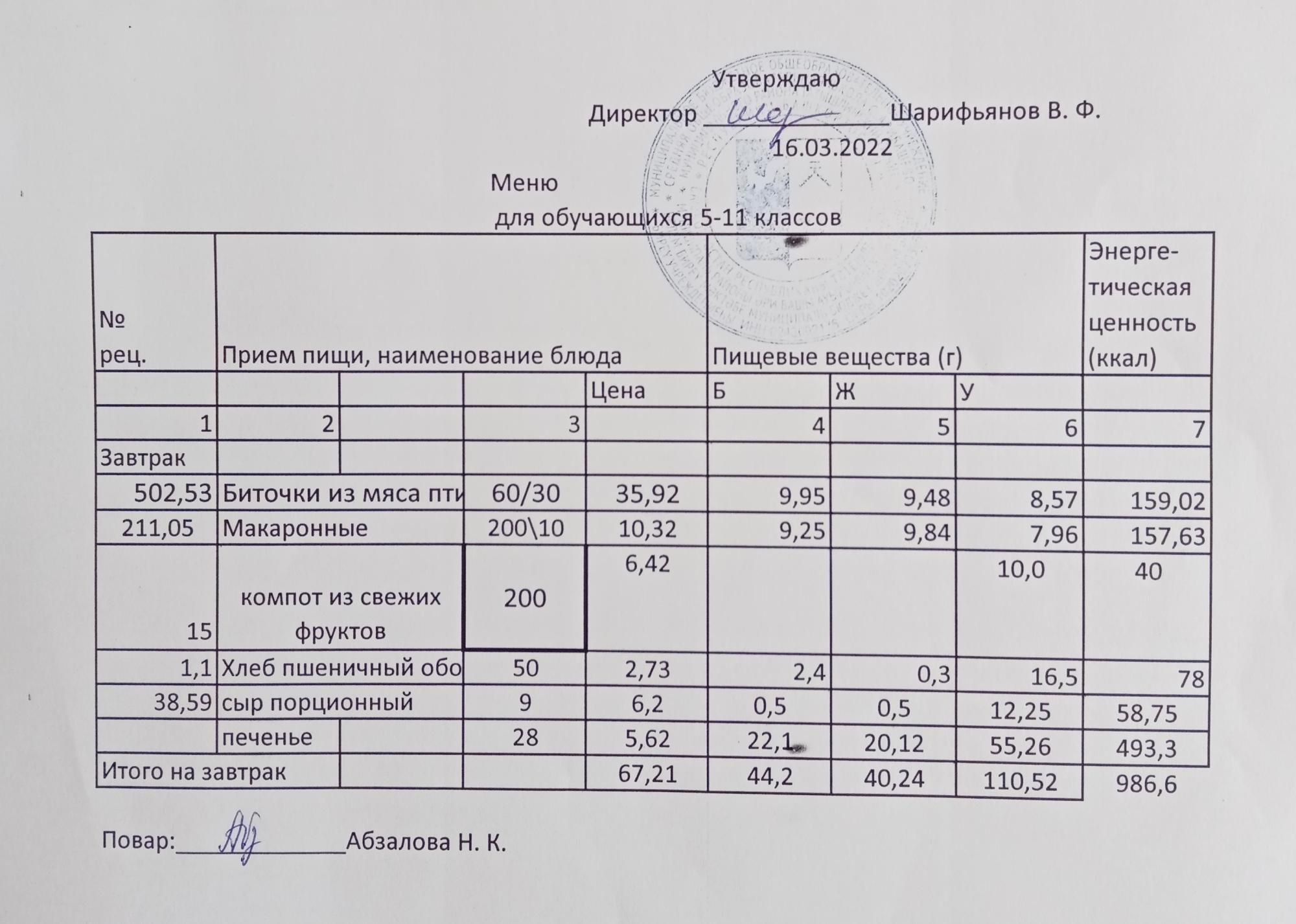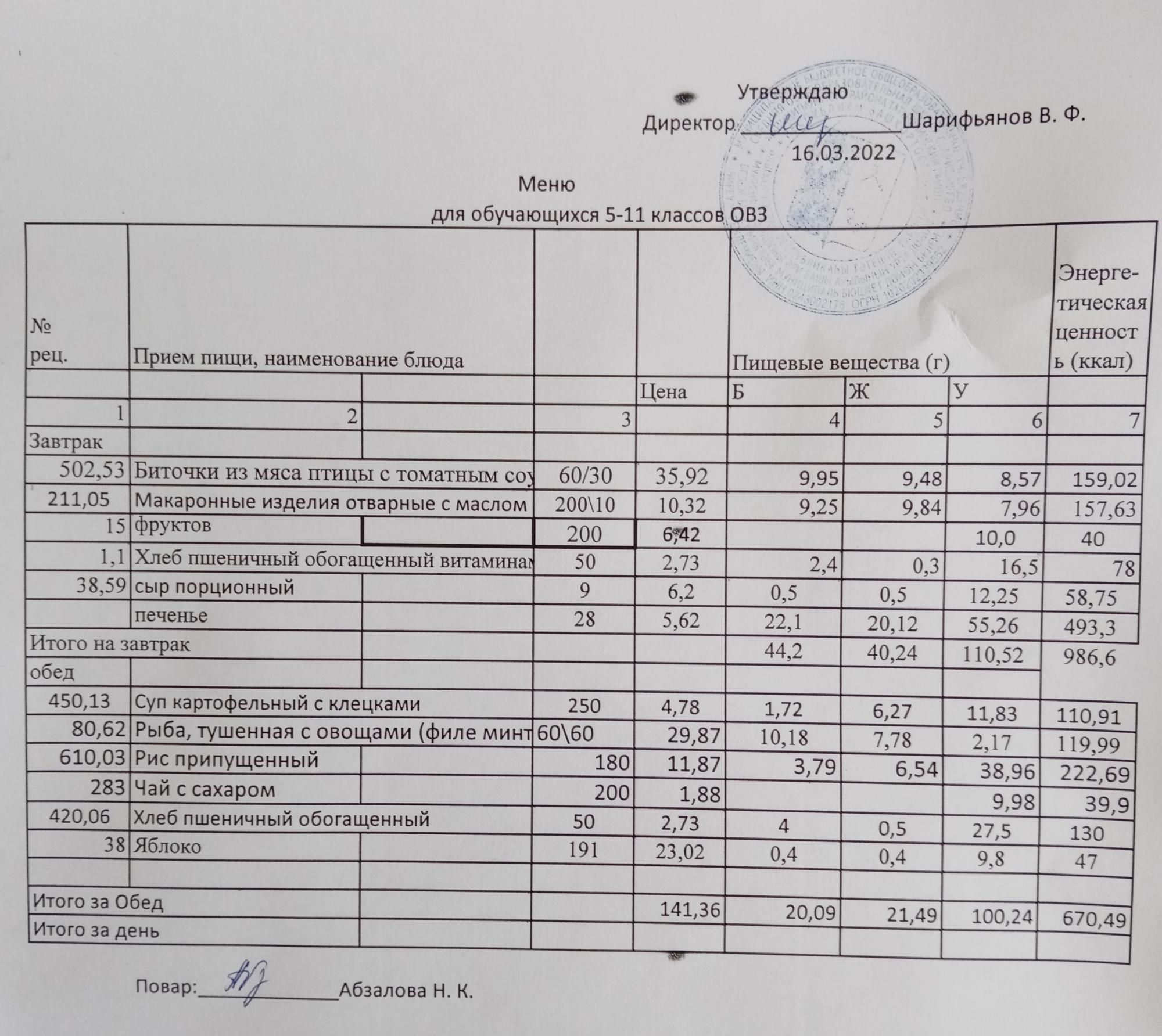 Меню на 16.03. для учащихся 5-11 кл с ОВЗ