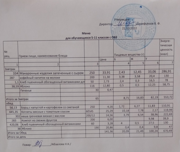 Меню на 21.03. для учащихся 5-11 кл с ОВЗ