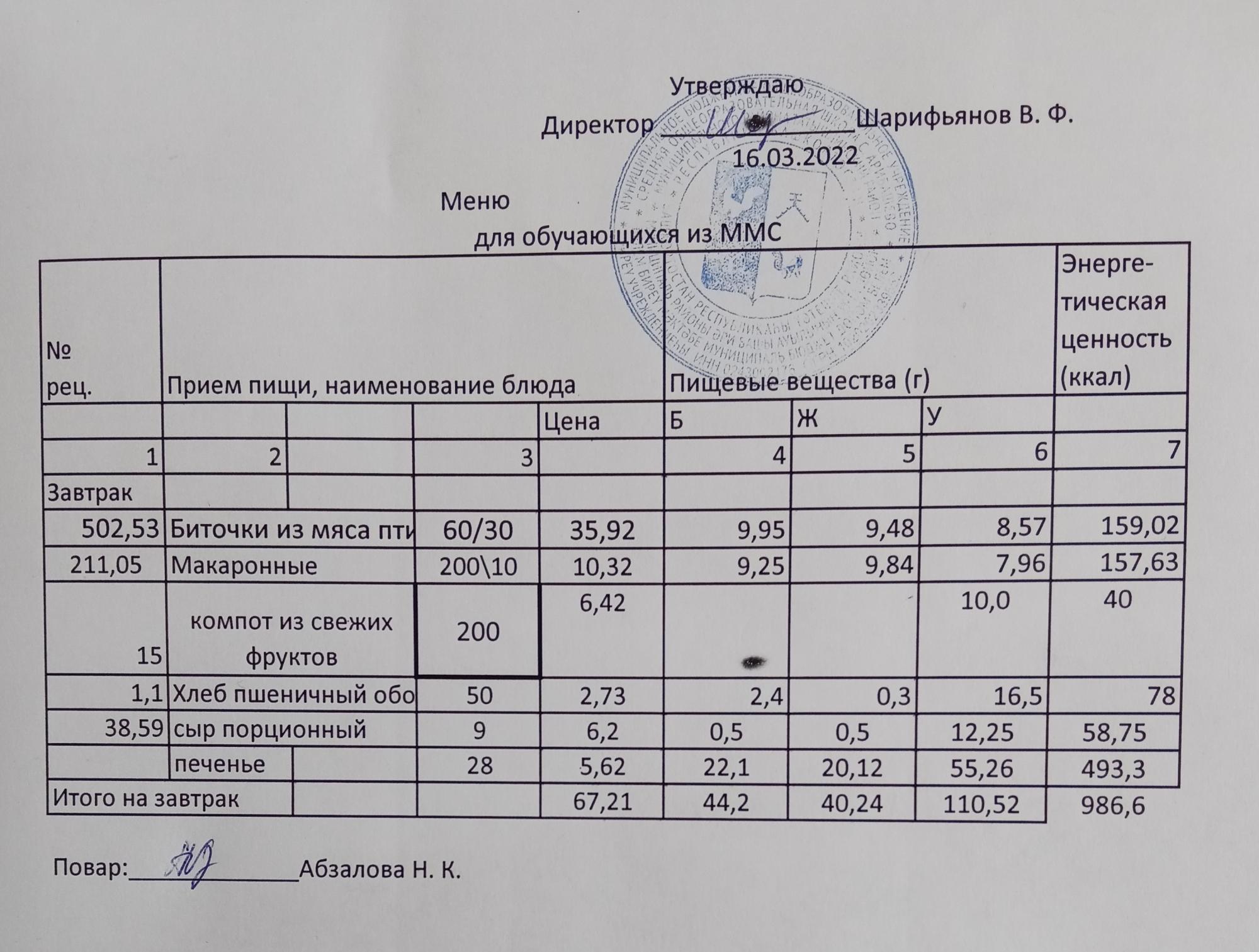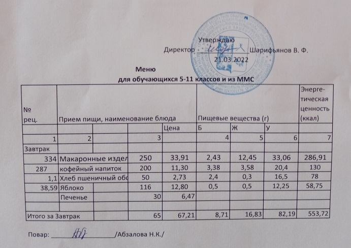 Меню на 21.03. для учащихся 5-11 кл и из ММС