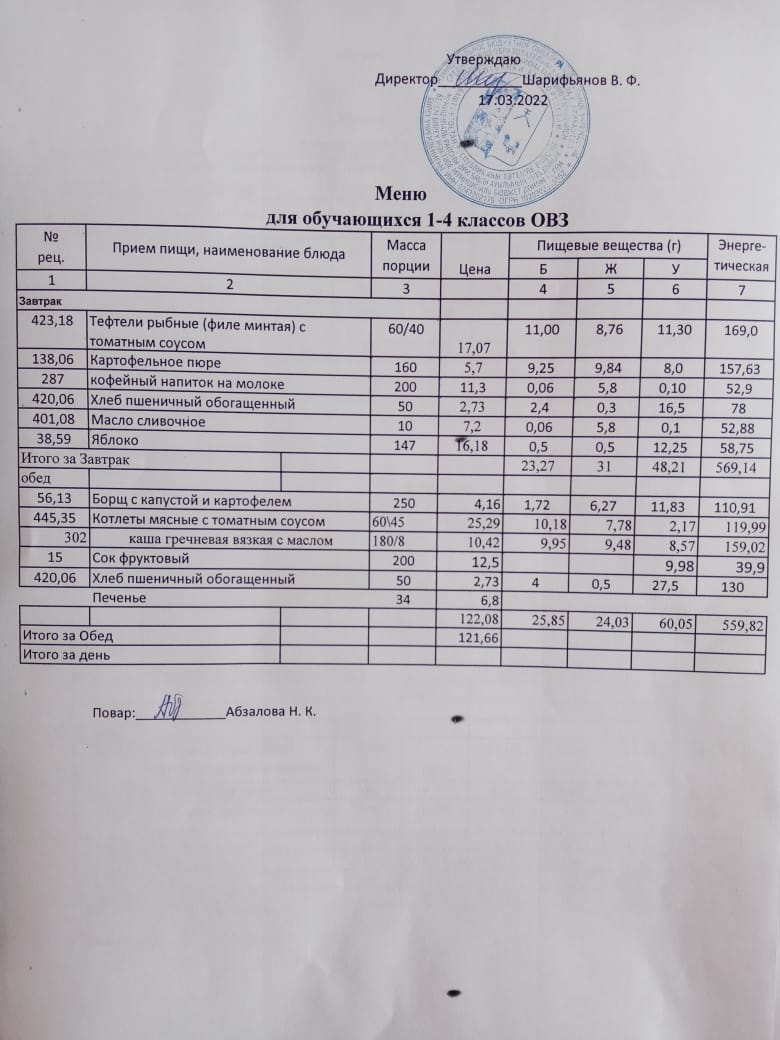 Меню на 17.03. для учащихся 1-4 кл с ОВЗ