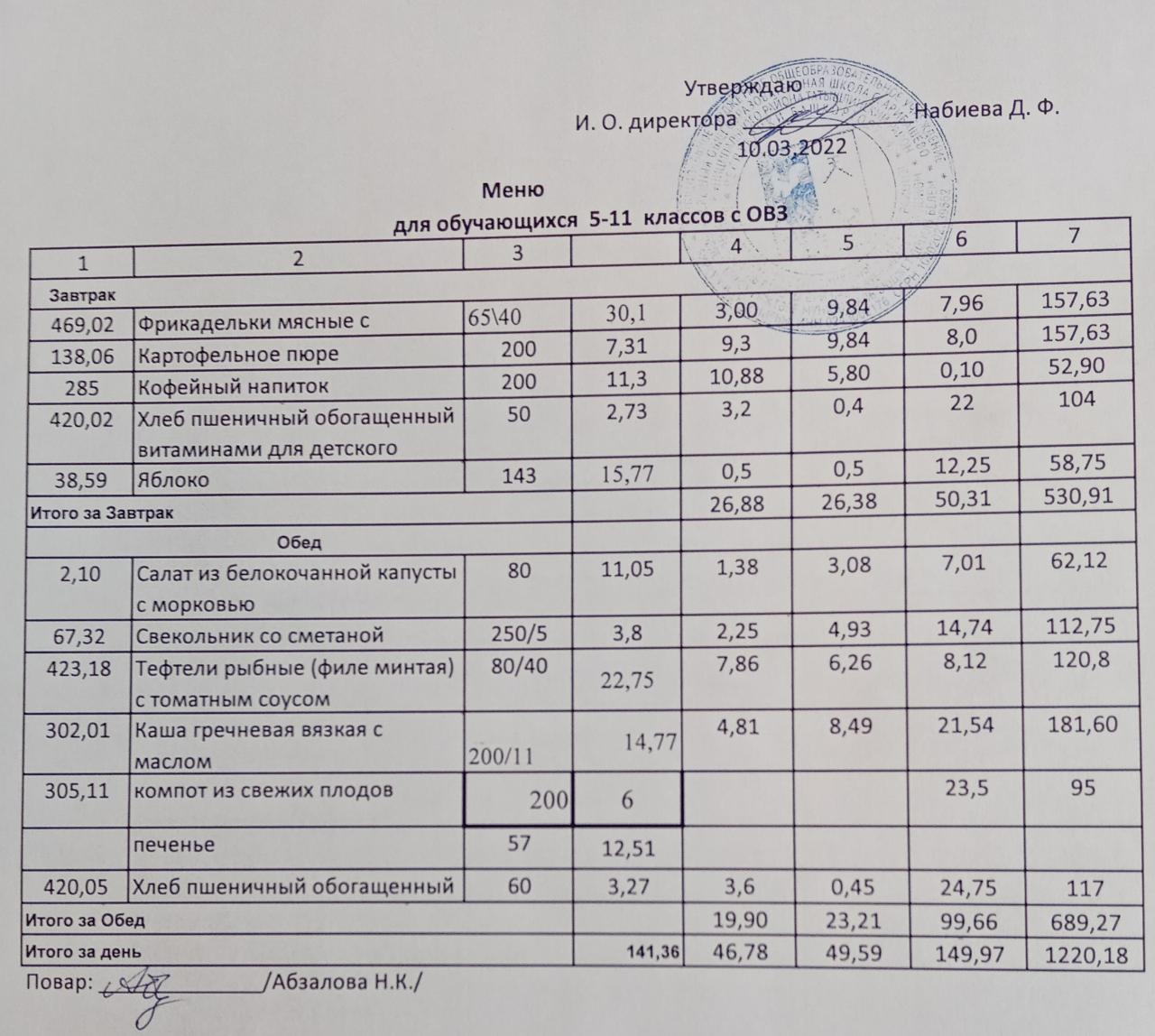 Меню на 11.03. для учащихся 5-11 кл с ОВЗ