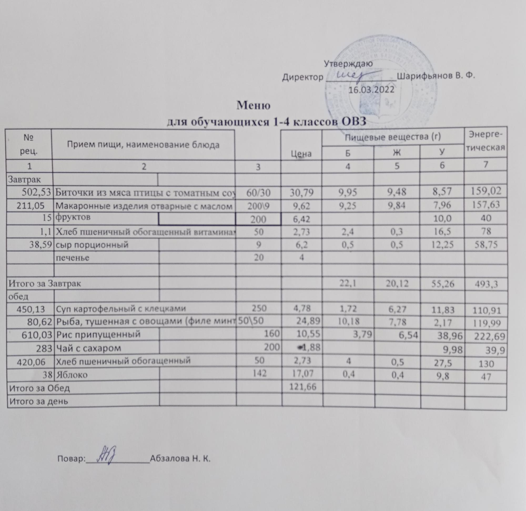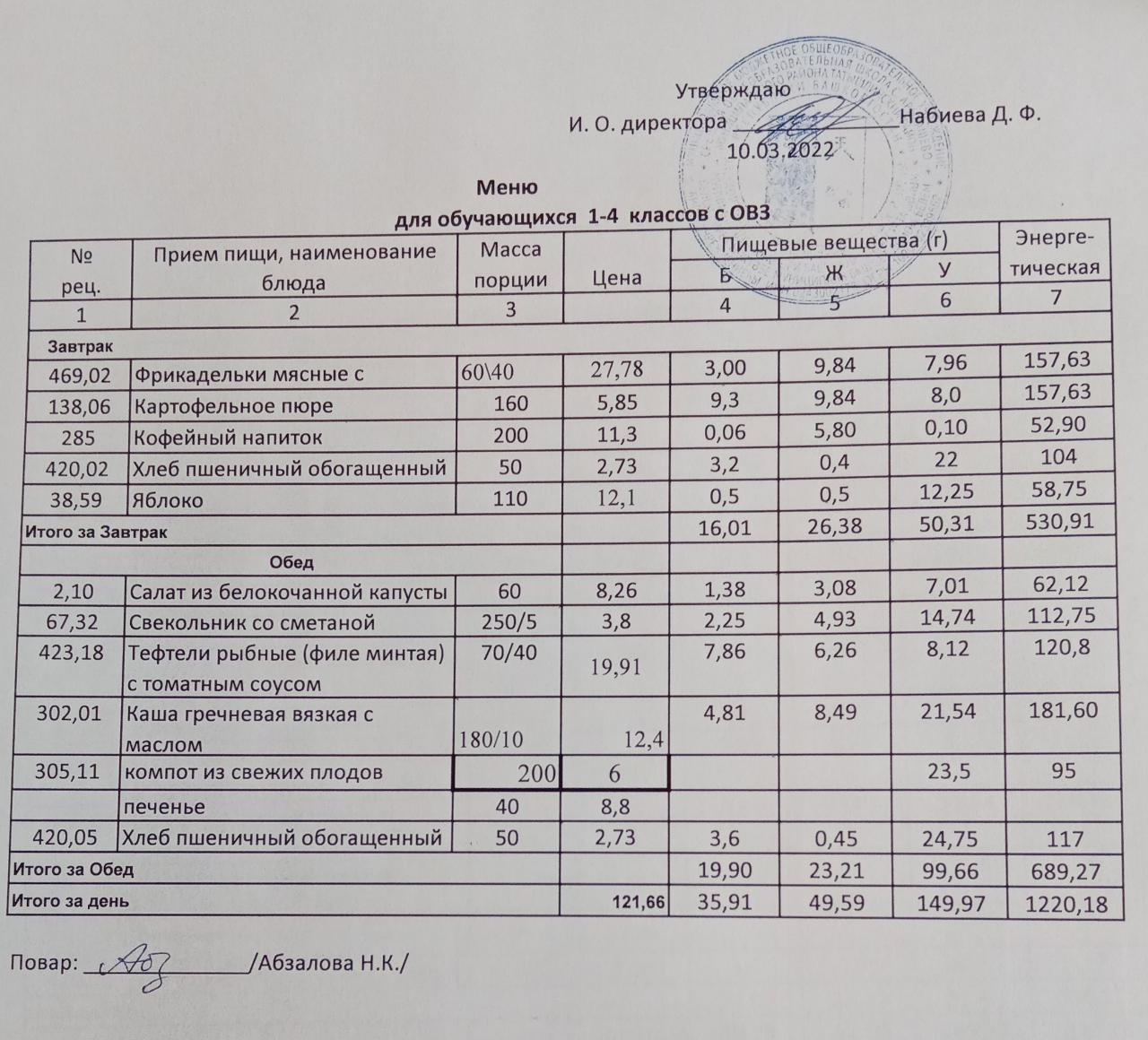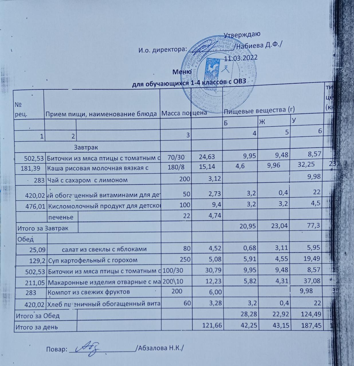 Меню на 16.03. для учащихся 1-4 кл с ОВЗ