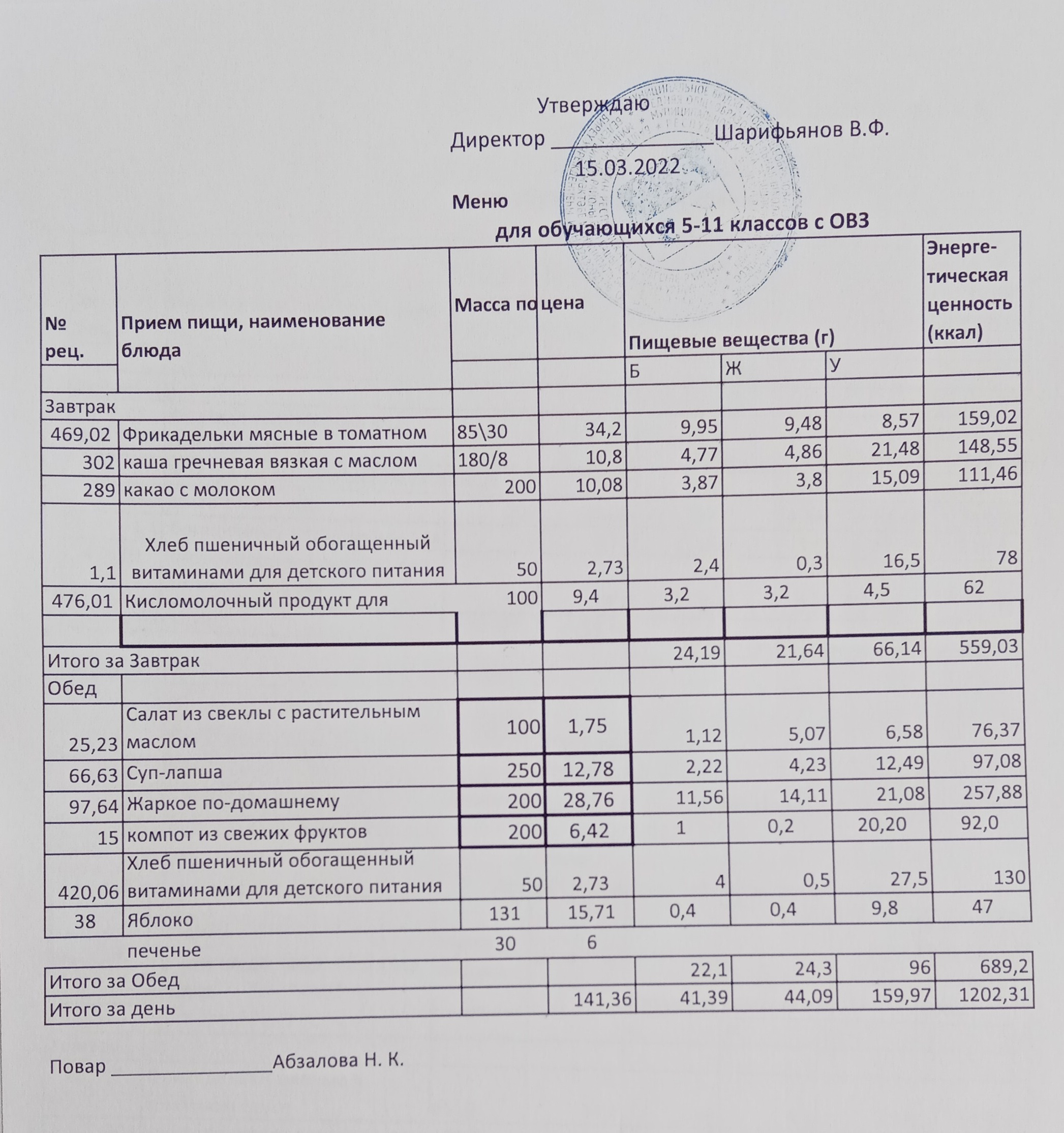 Меню на 15.03. для учащихся 5-11 кл с ОВЗ