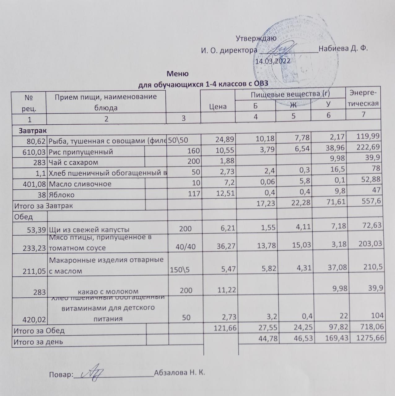 Меню на 14.03. для учащихся 1-4 кл с ОВЗ