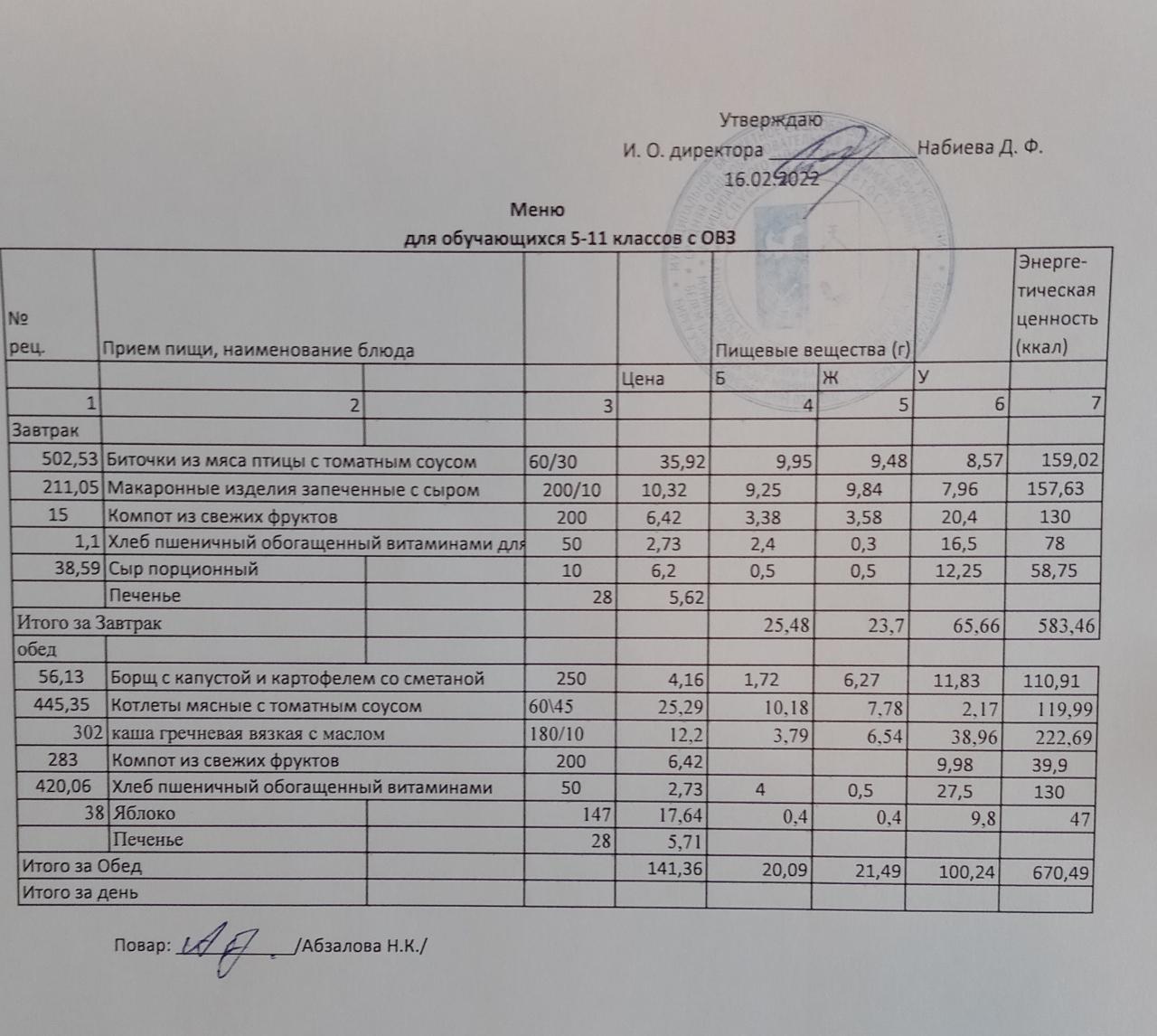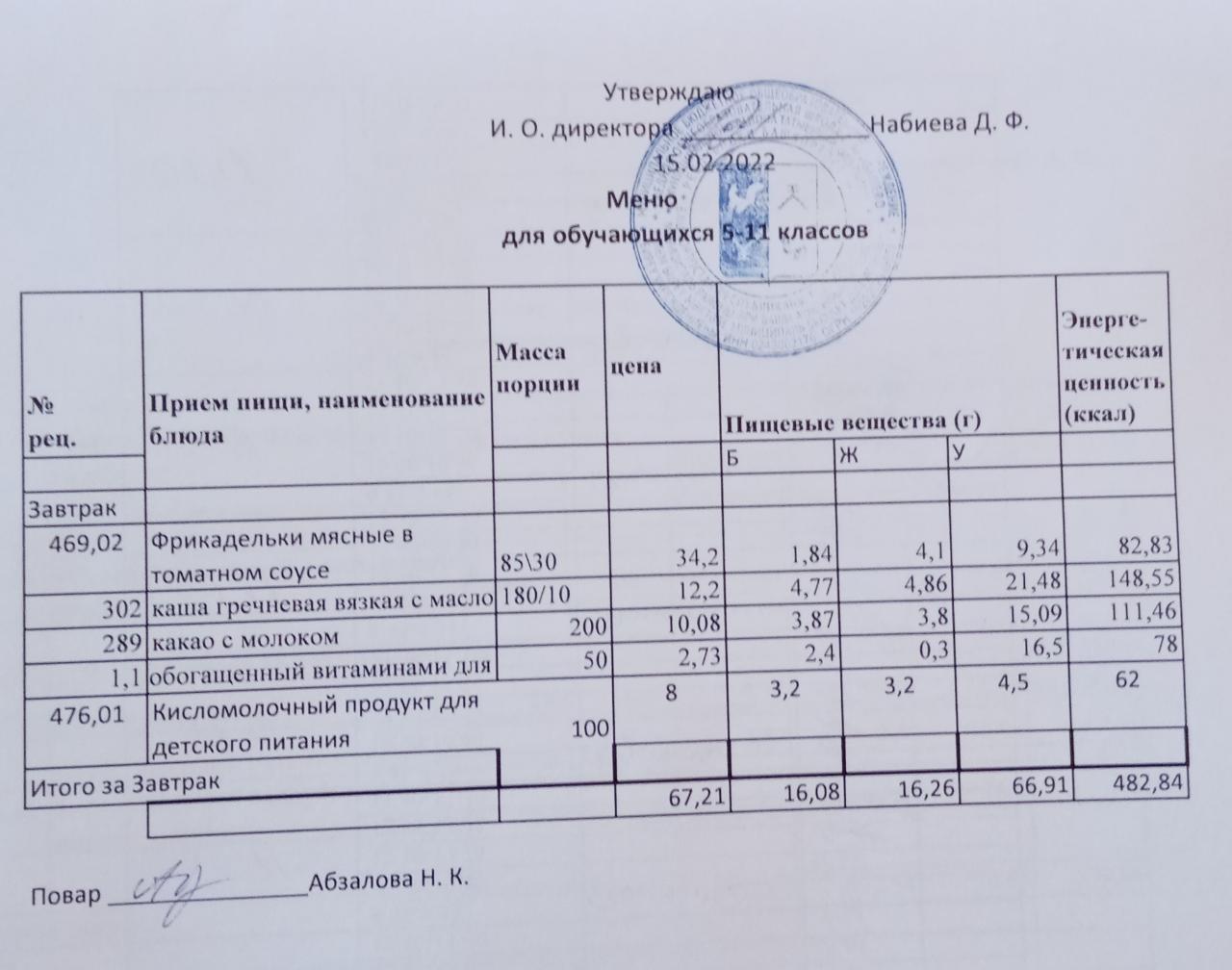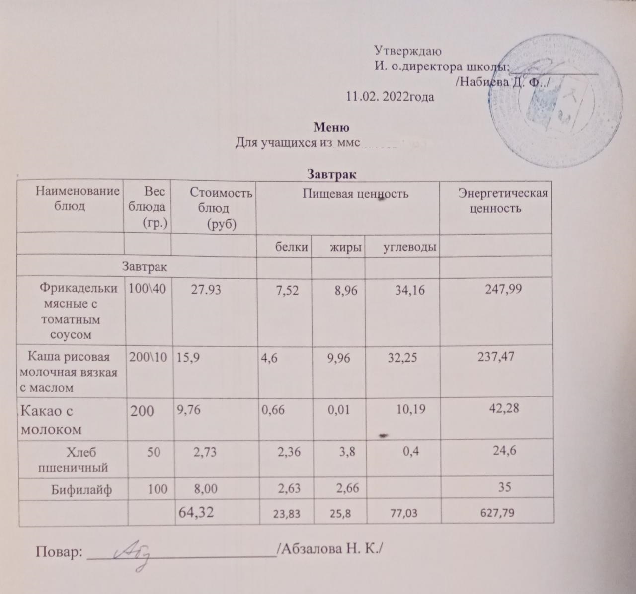 Меню на 15.02. для учащихся из ММС