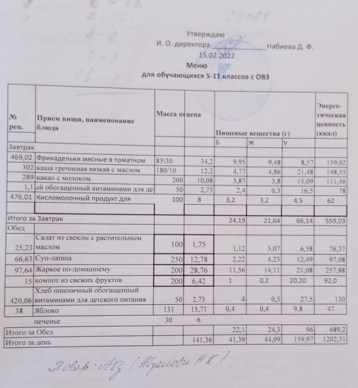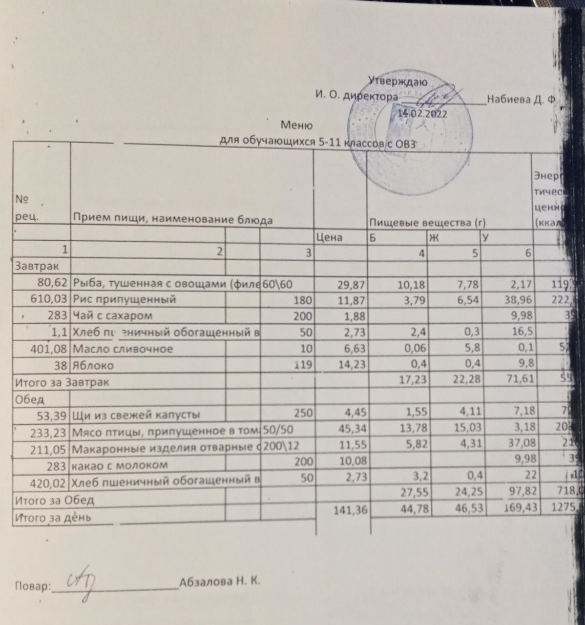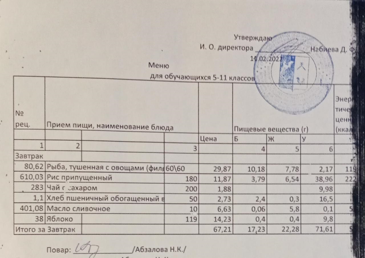 Меню на 15.02. для учащихся из ММС