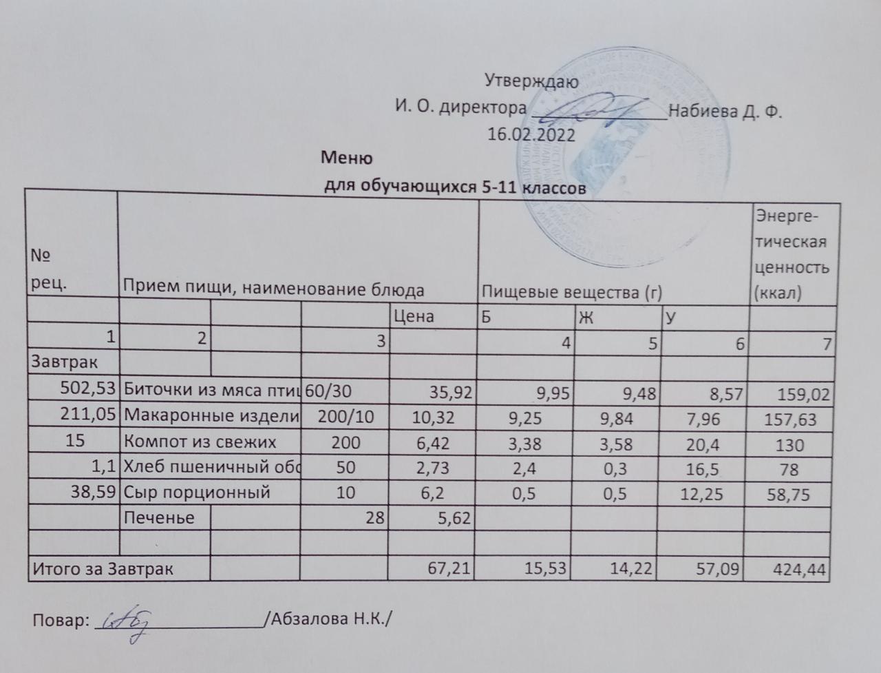 Меню на 16.02. для учащихся из ММС