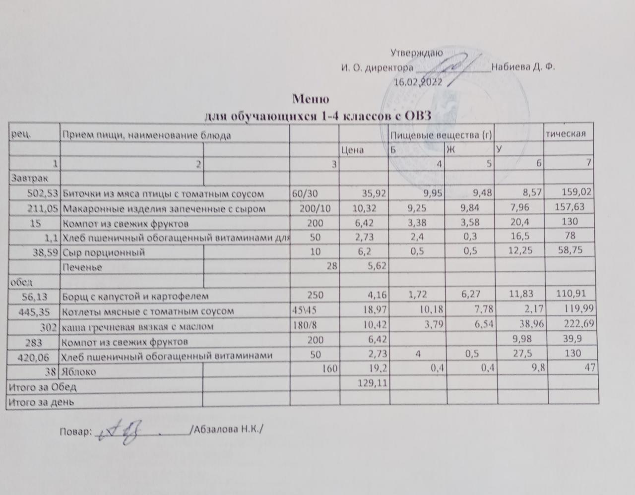 Меню на 16.02. для учащихся 1-4 кл с ОВЗ