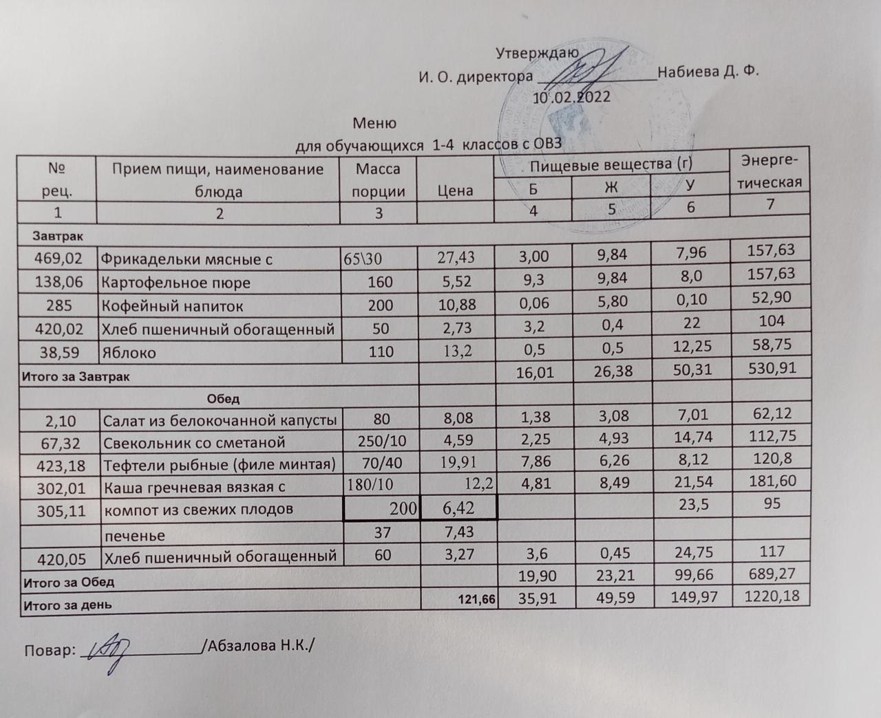 Меню на 10.02. для учащихся 1-4 кл с ОВЗ