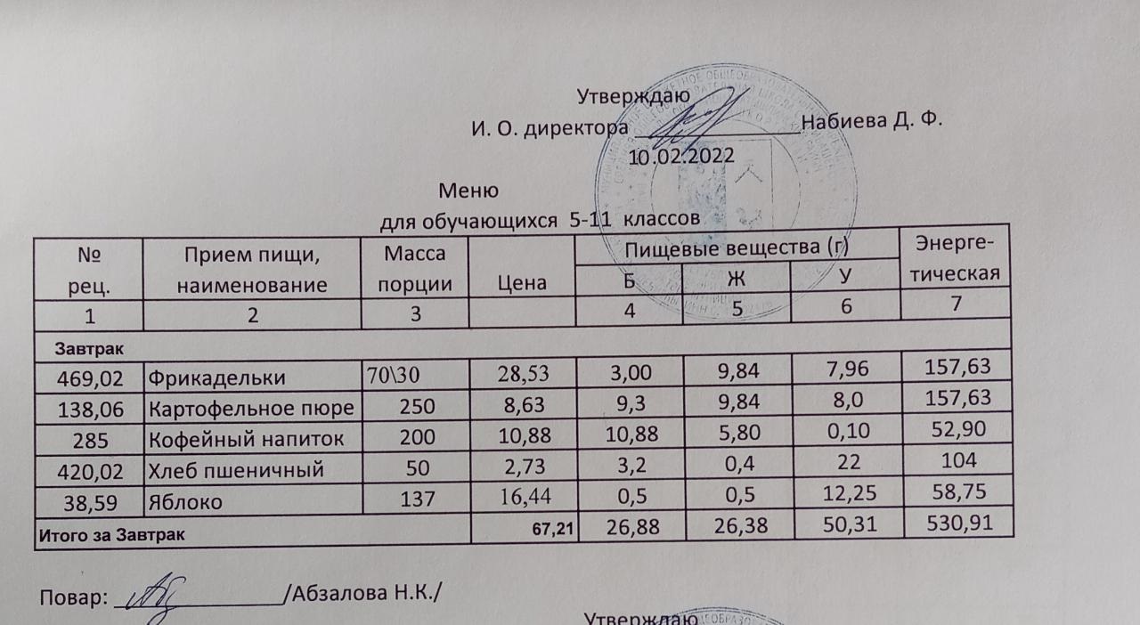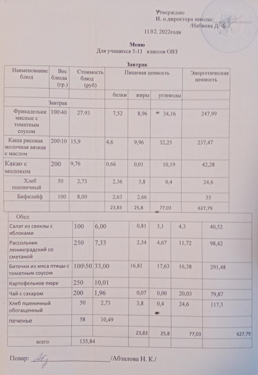 Меню на 11.02. для учащихся из ММС
