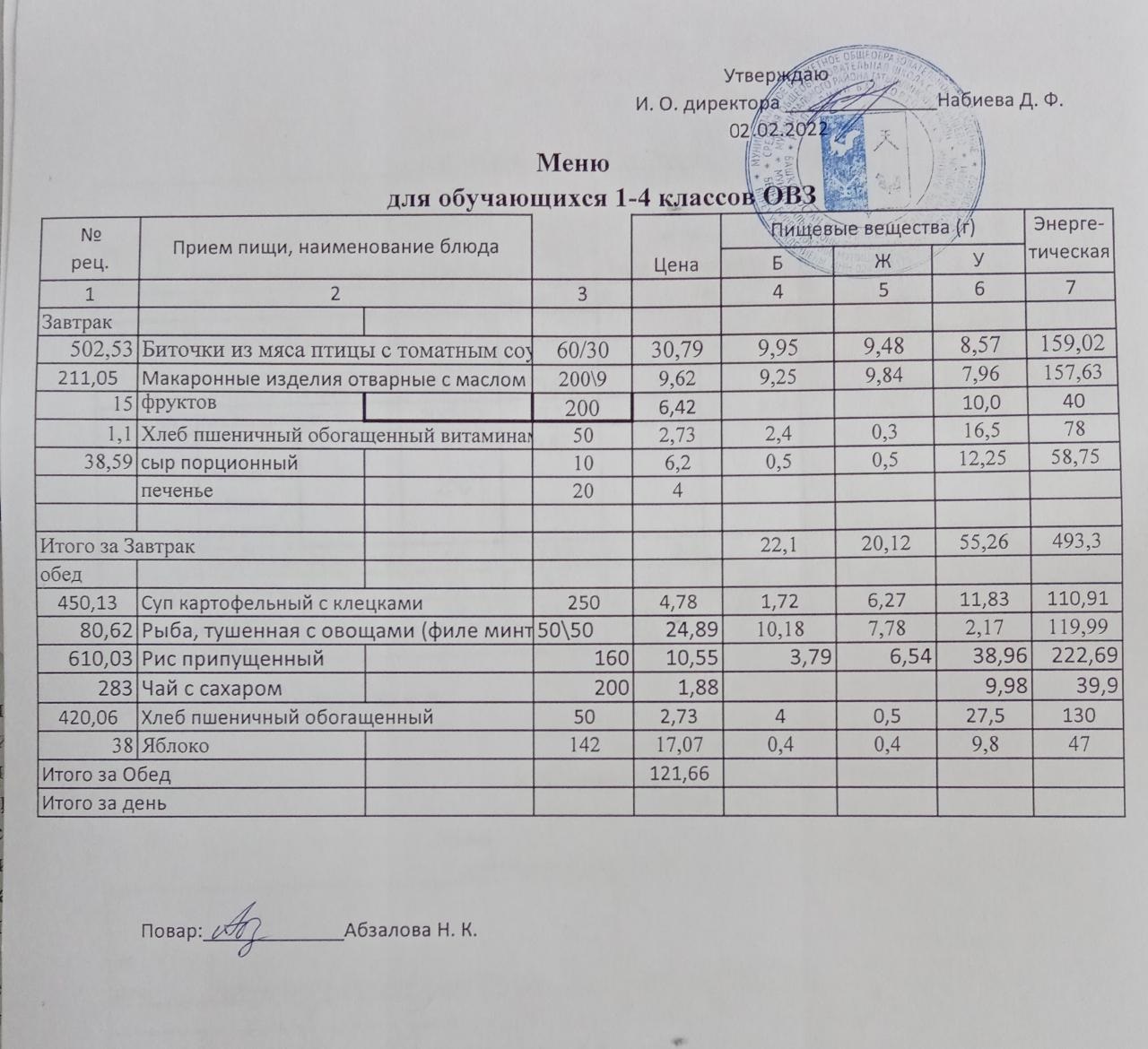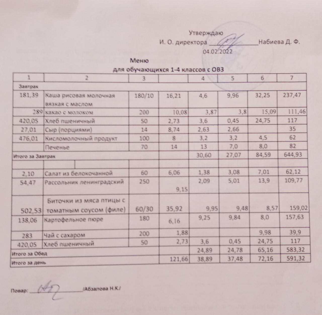 Меню на 04.02. для учащихся 1-4 кл с ОВЗ