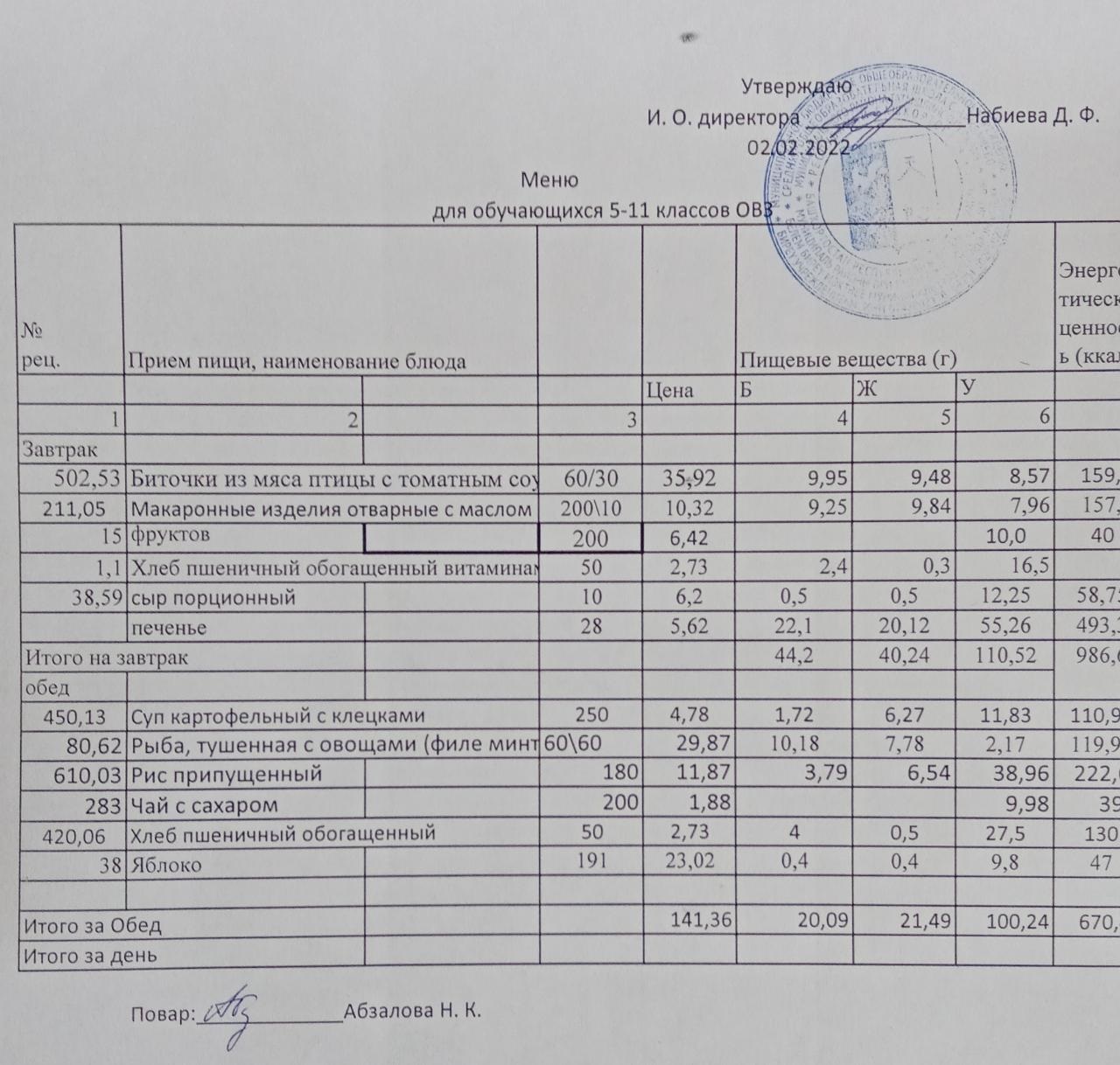 Меню на 02.02. для учащихся 5-11 кл с ОВЗ