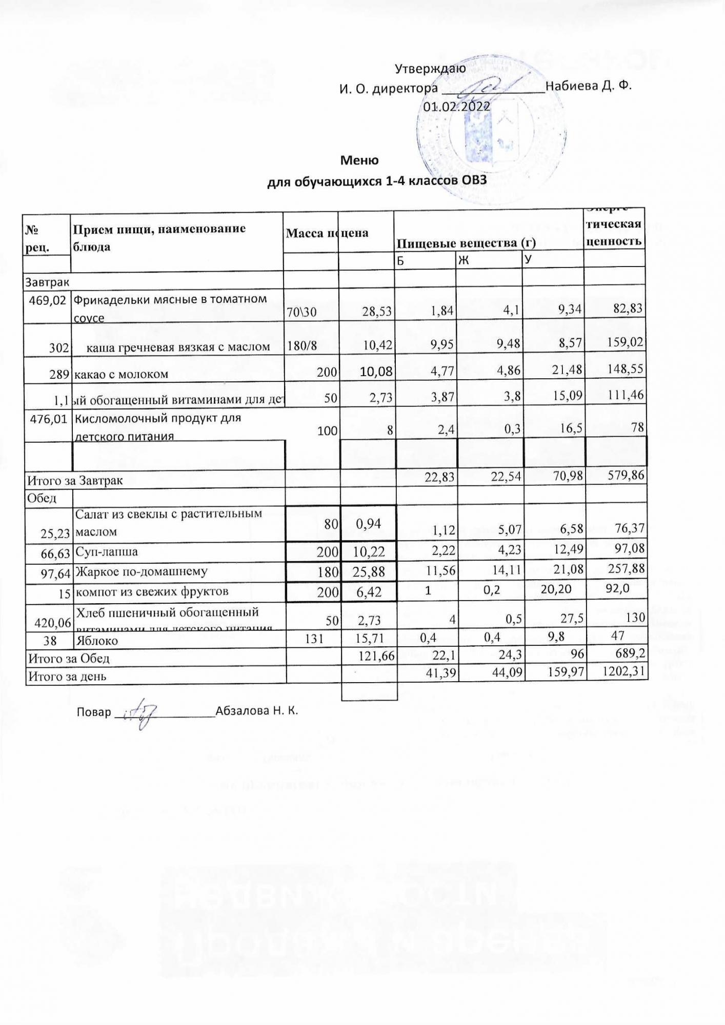 Меню на 01.02. для учащихся 1-4 кл с ОВЗ