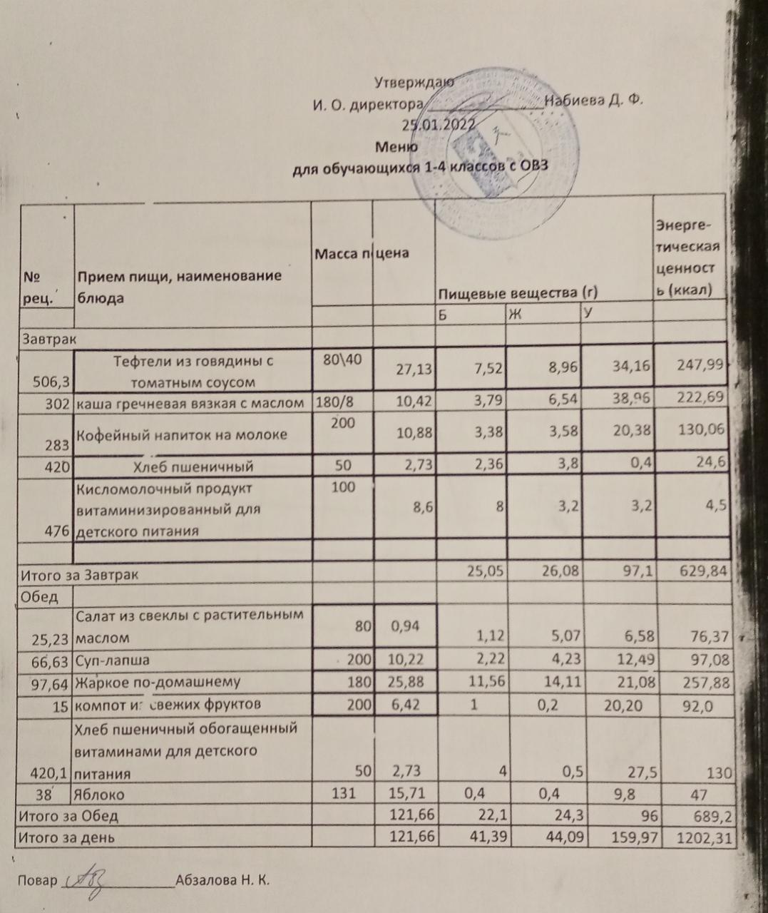 Меню на 25.01. для учащихся 1-4 кл с ОВЗ