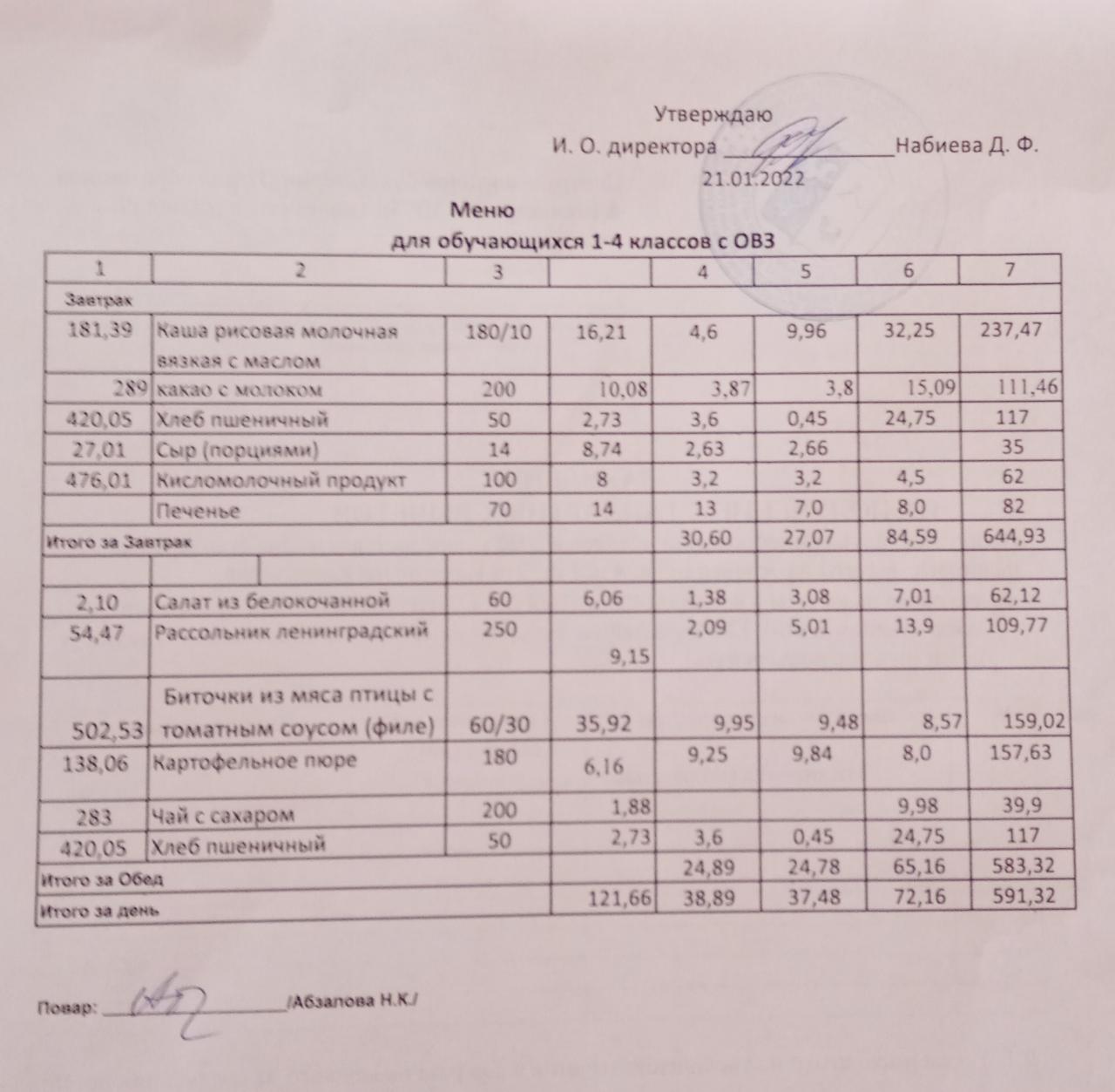 Меню на 21.01. для учащихся 1-4 кл с ОВЗ