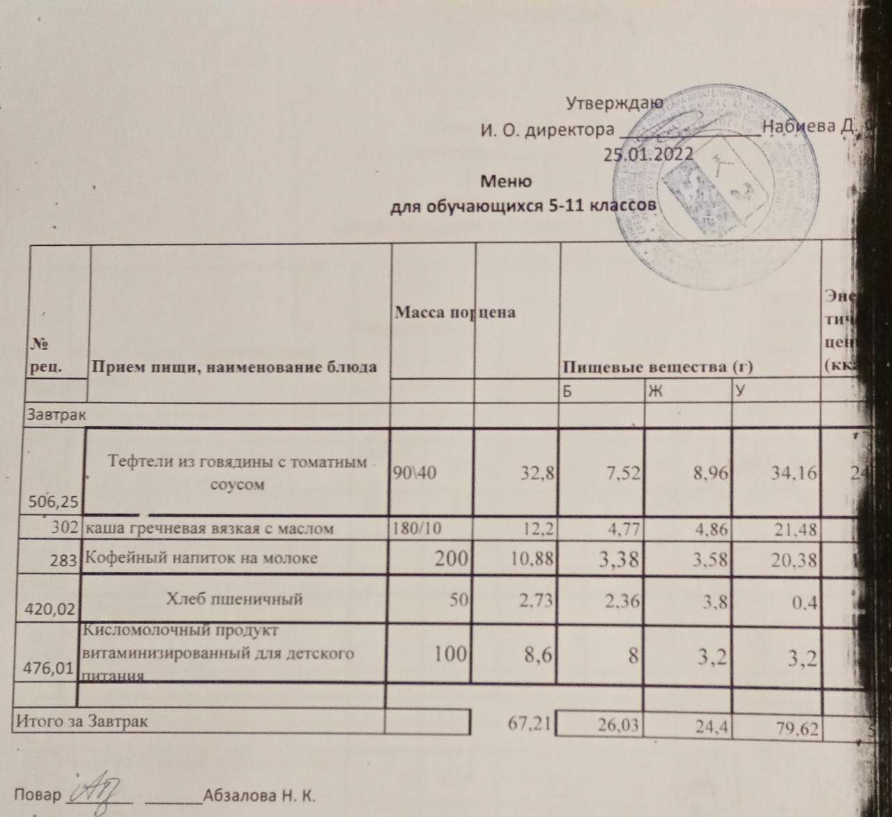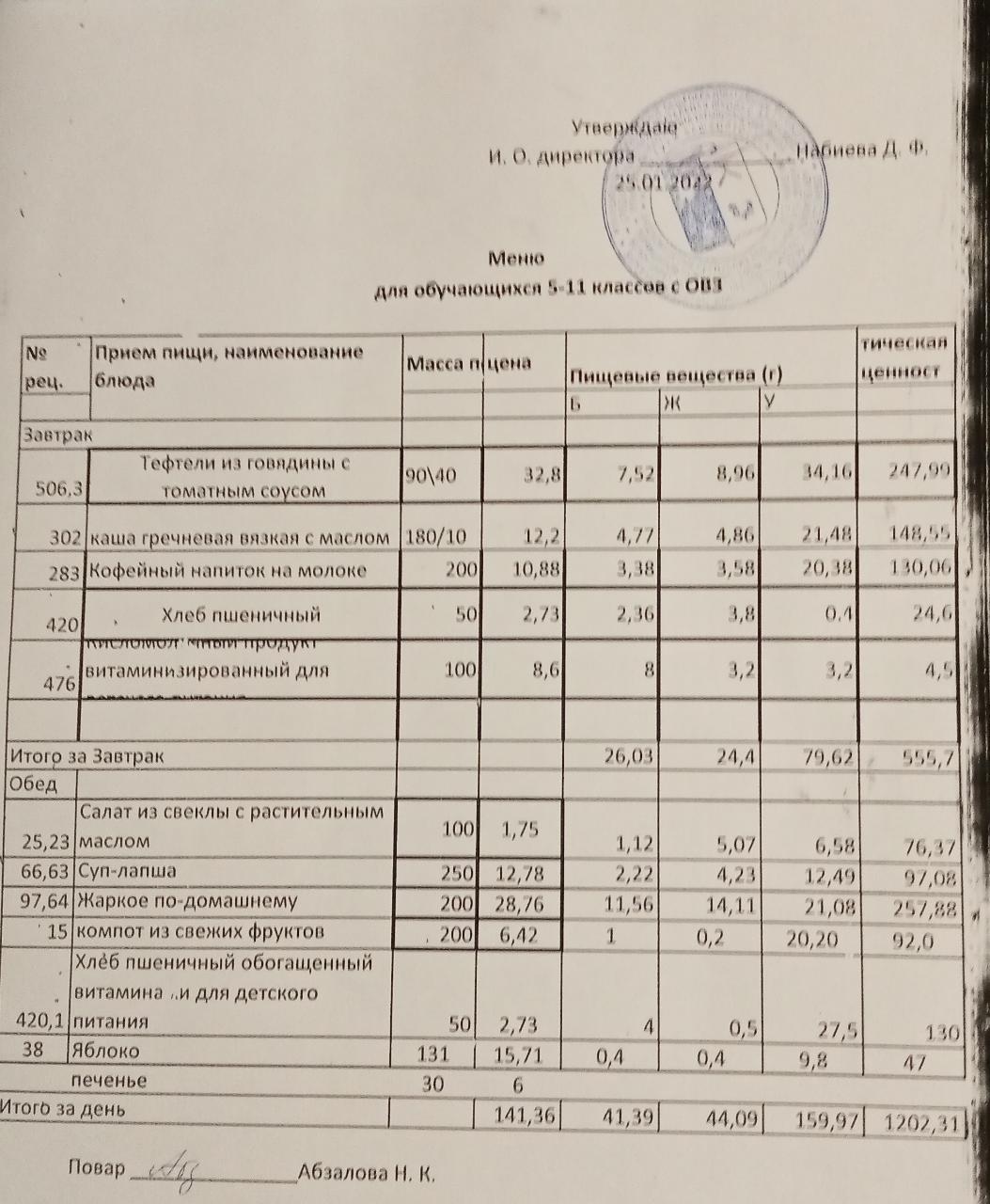Меню на 25.01. для учащихся 5-11 кл с ОВЗ