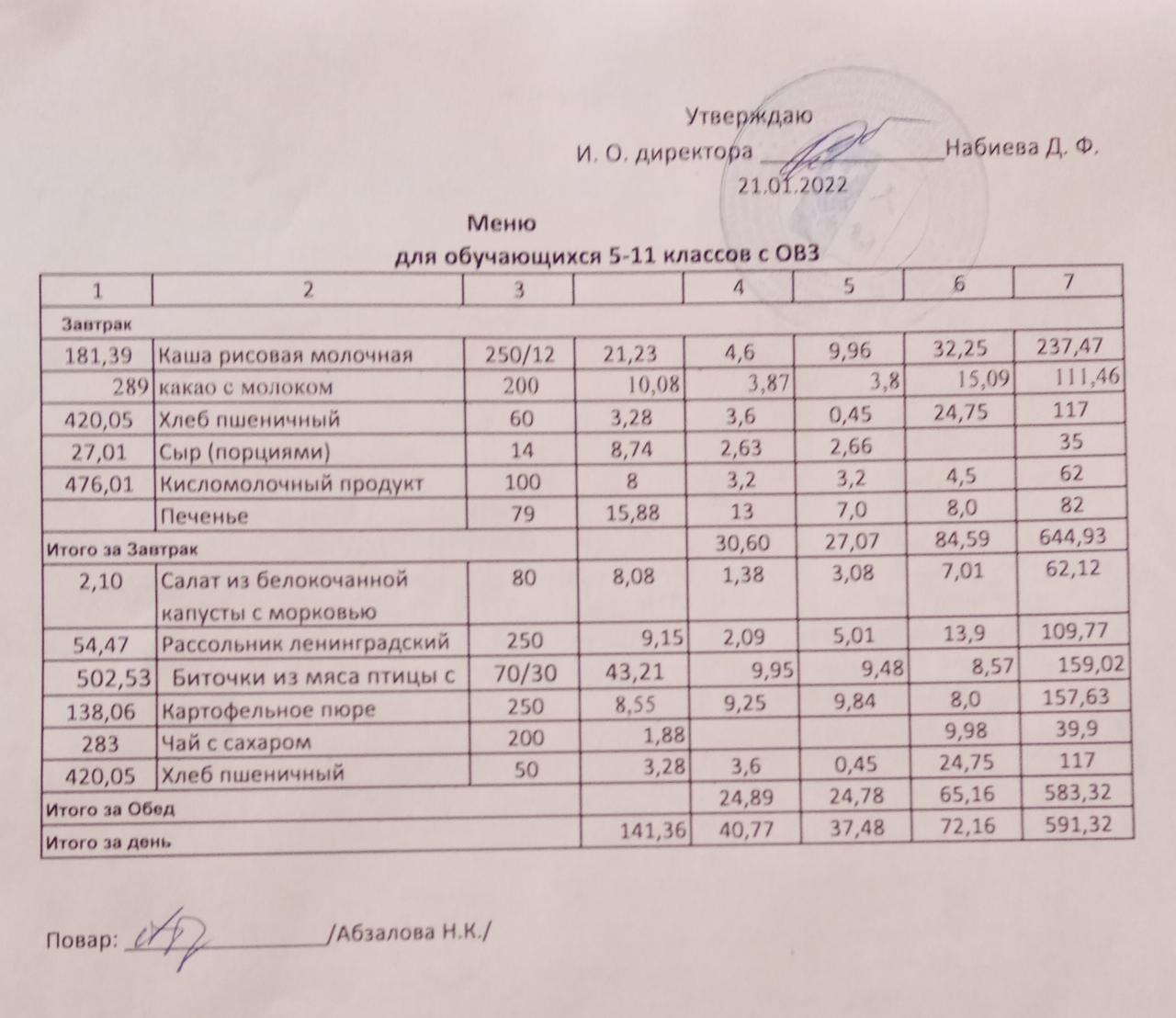 Меню на 21.01. для учащихся 5-11 кл с ОВЗ