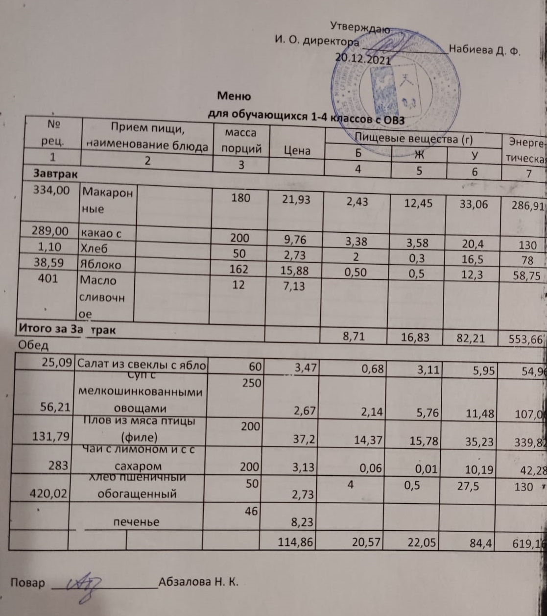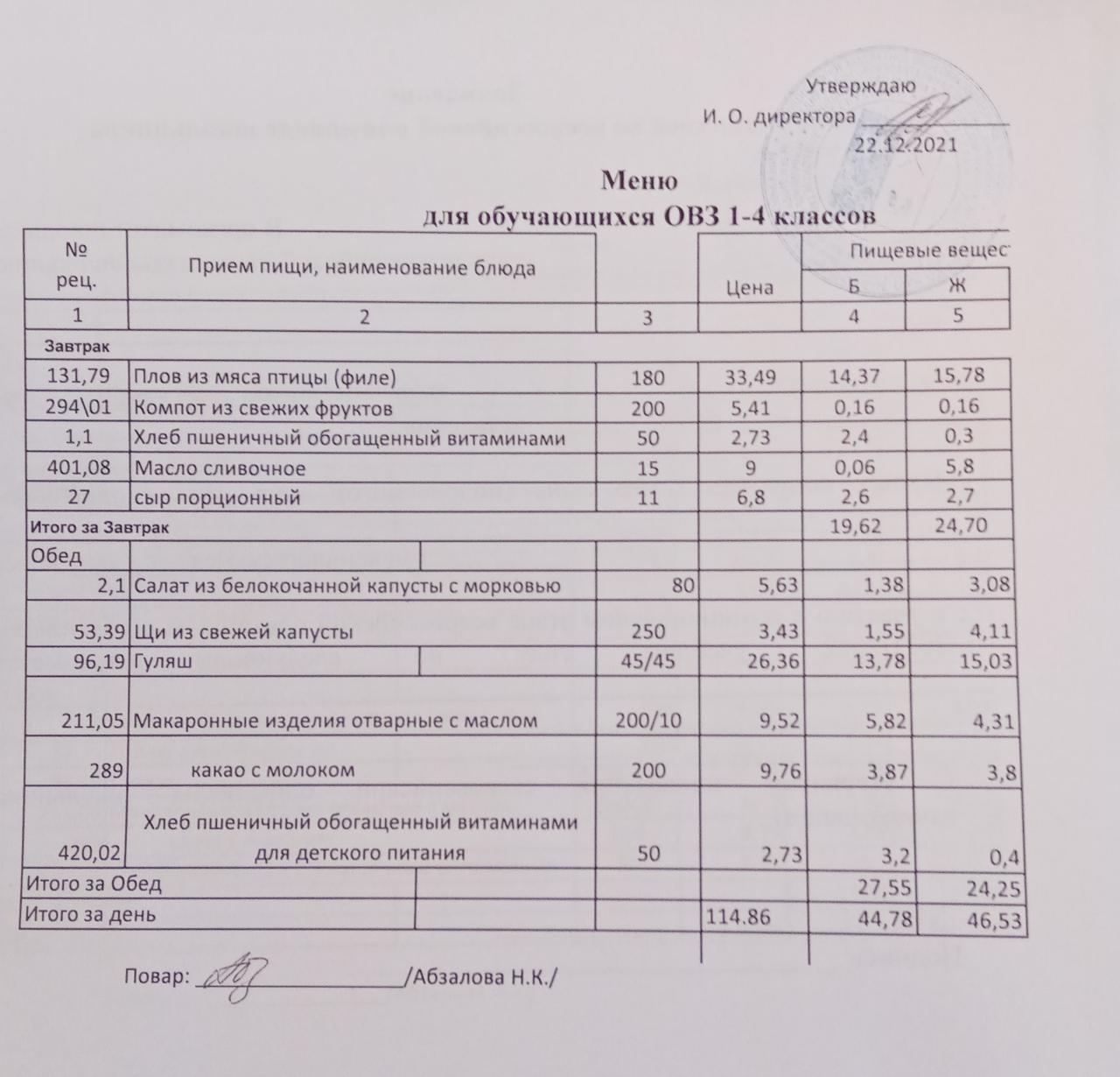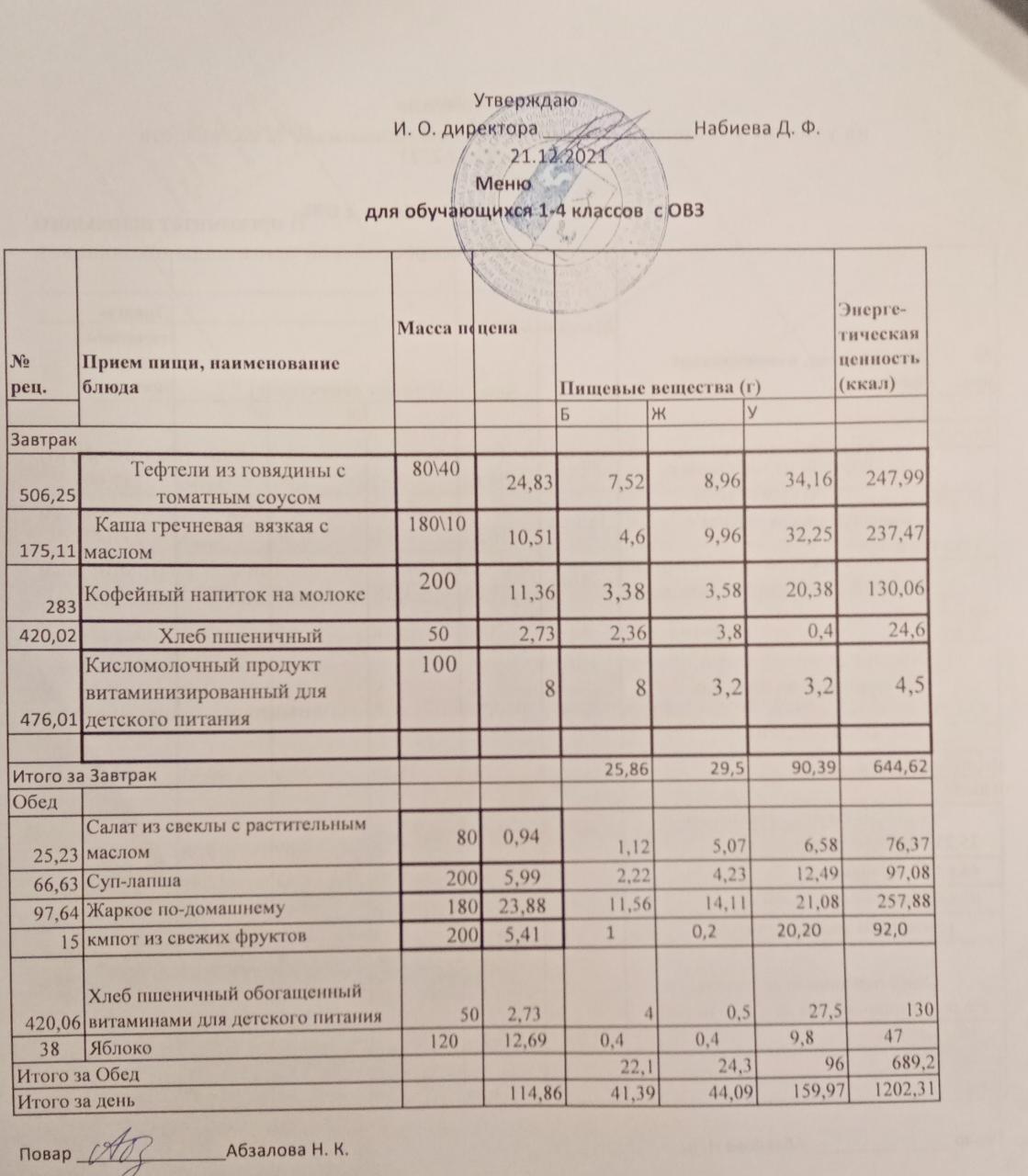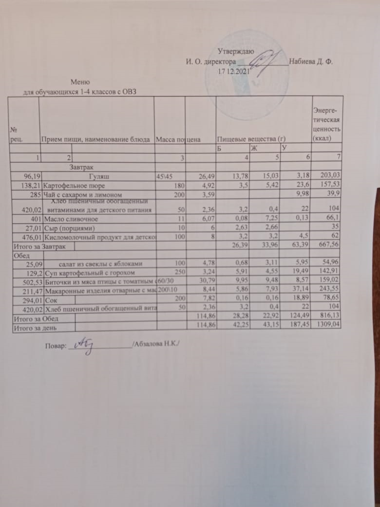 Меню на 21.12. для учащихся 1-4 кл с ОВЗ