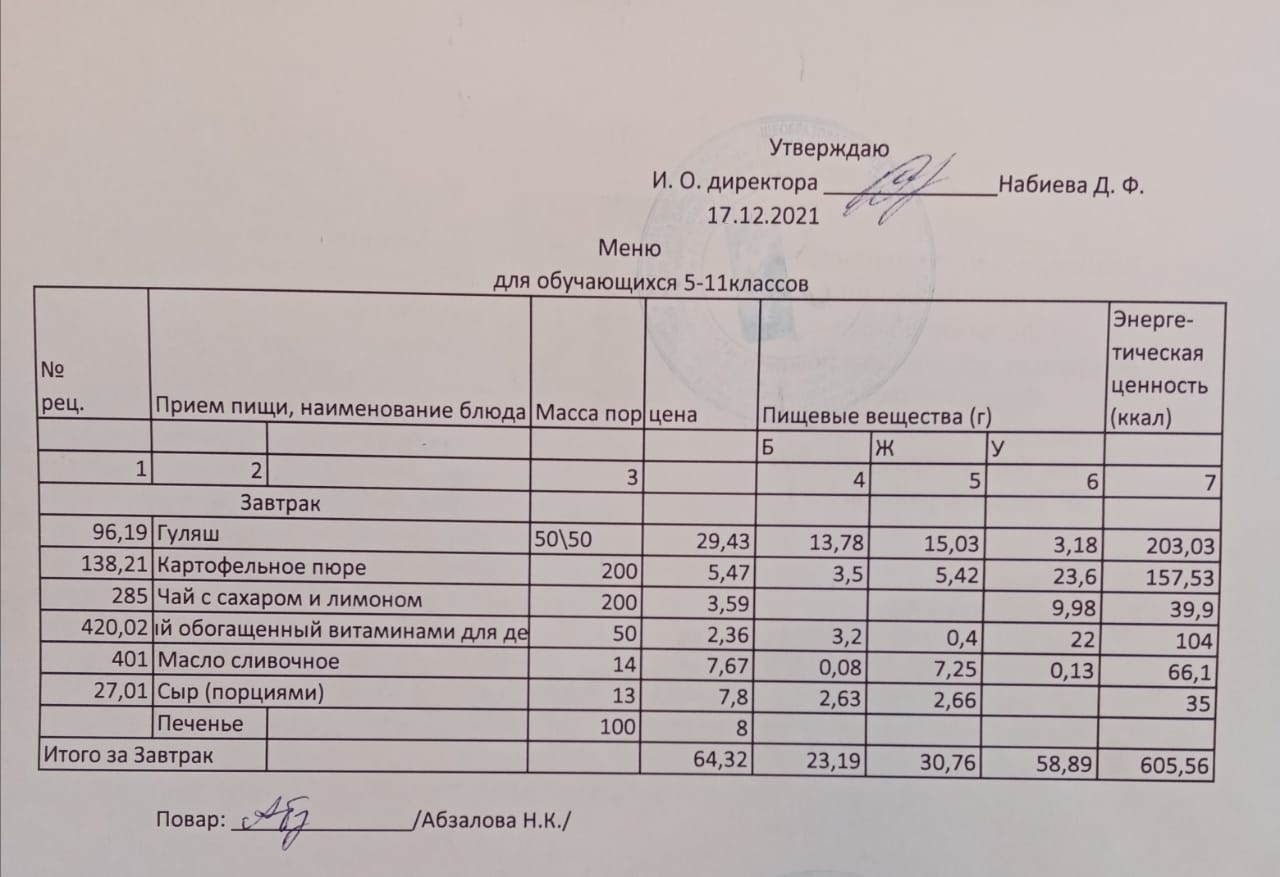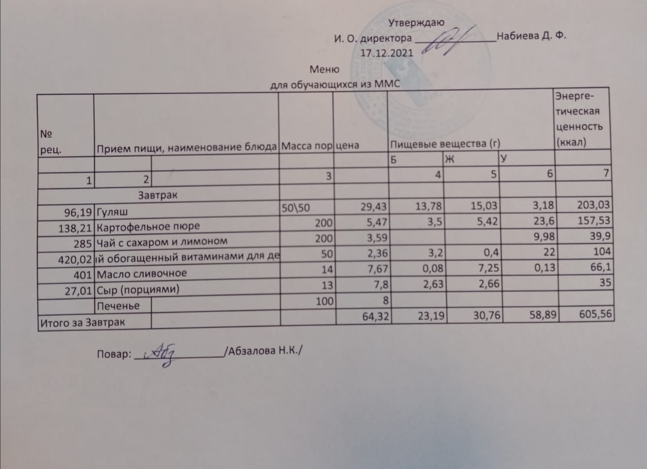 Меню на 17.12. для учащихся из ММС