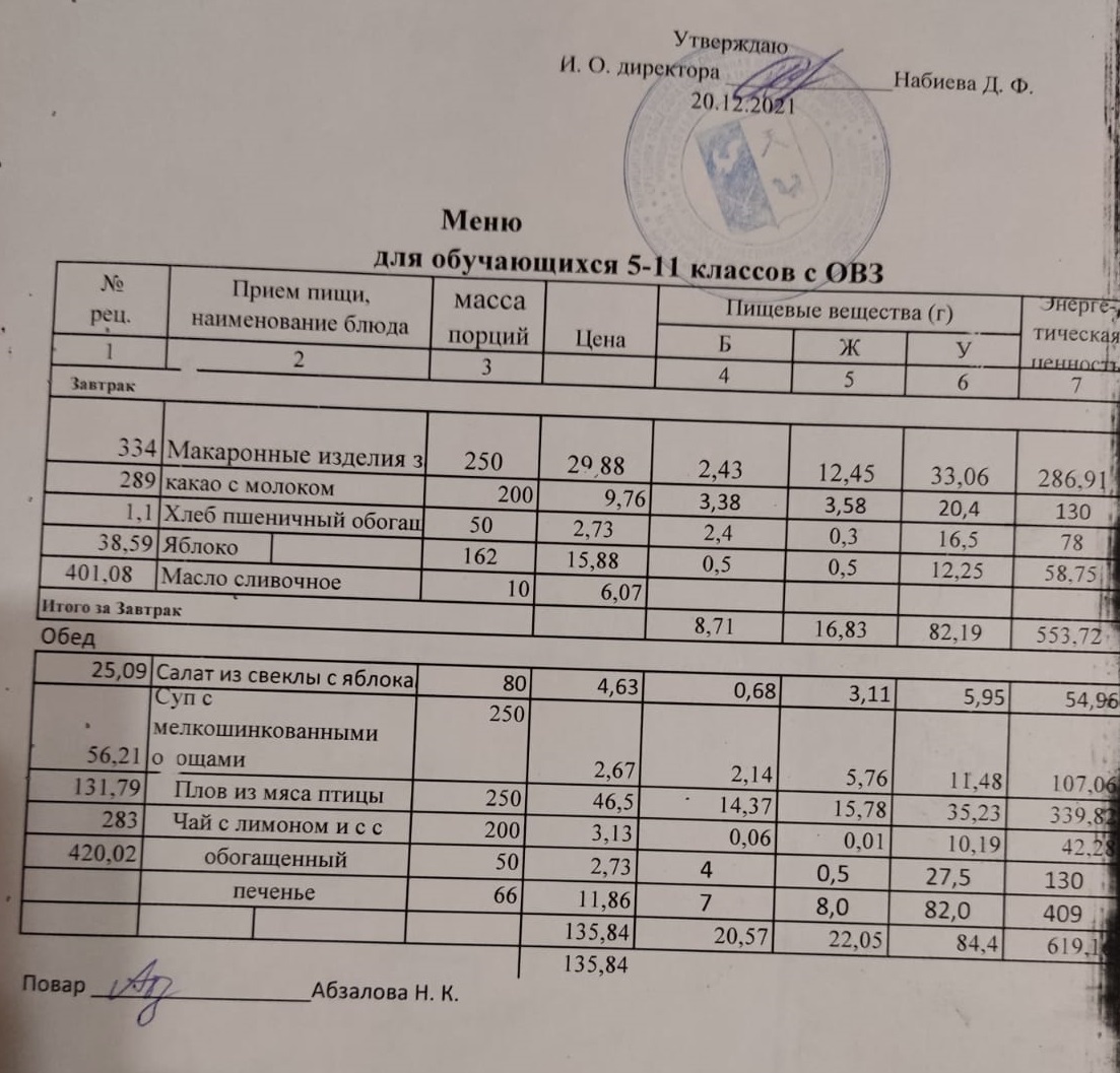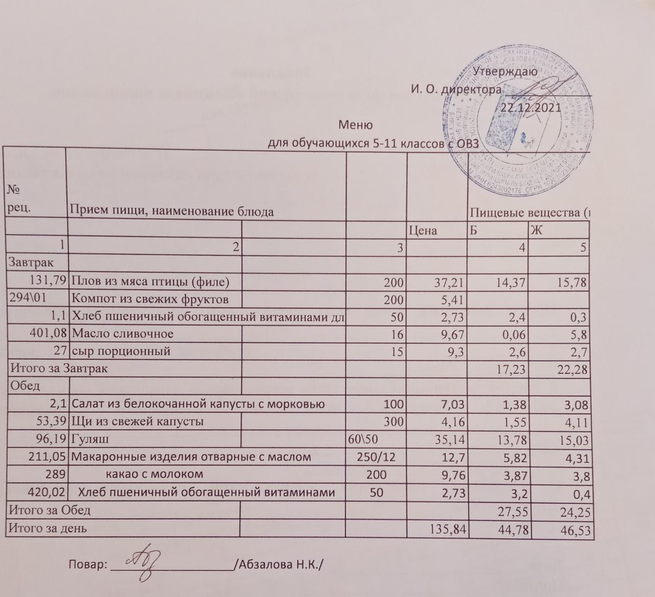 Меню на 21.12. для учащихся 5-11 кл с ОВЗ