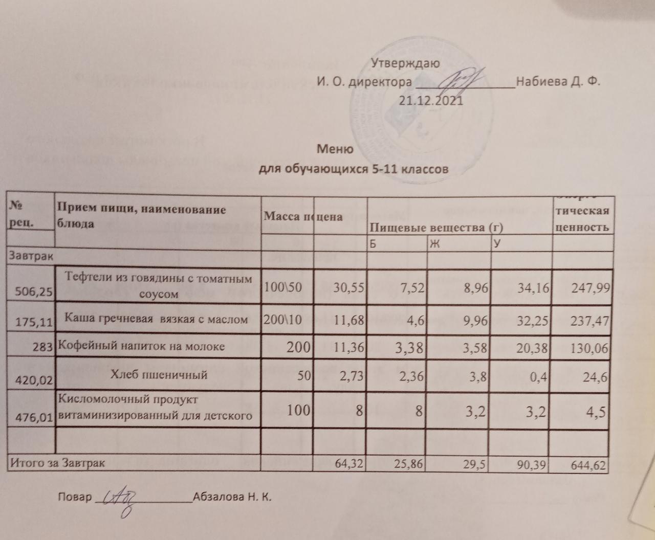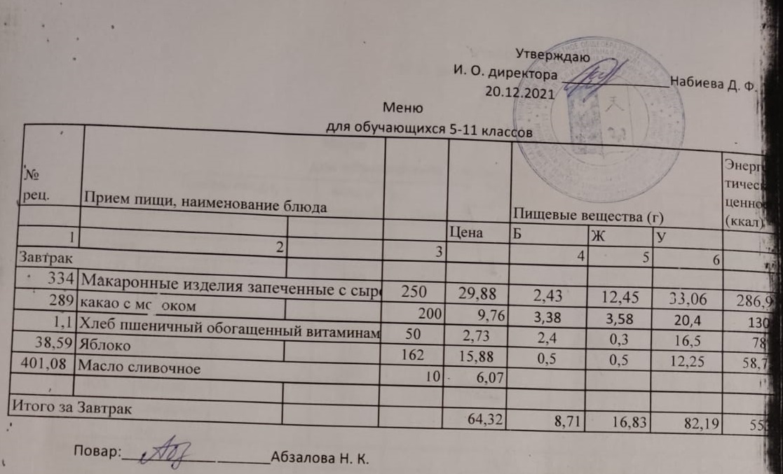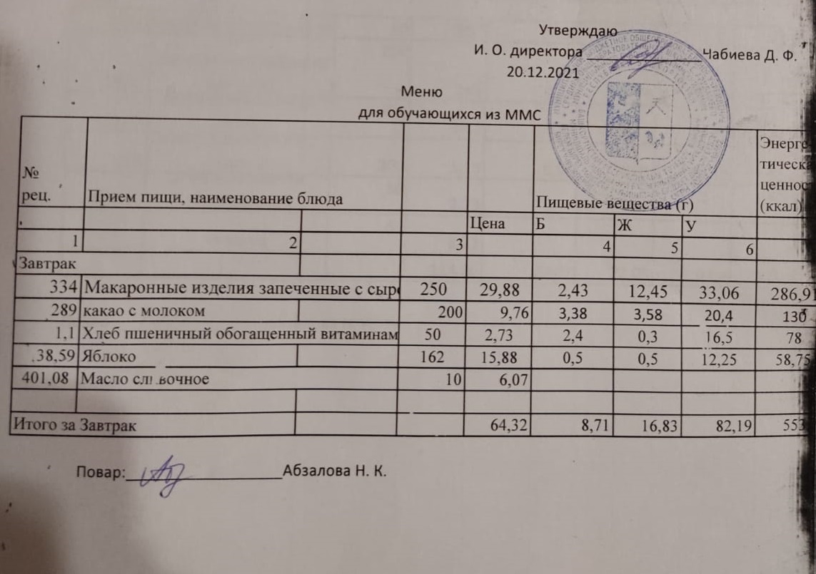 Меню на 20.12. для учащихся из ММС