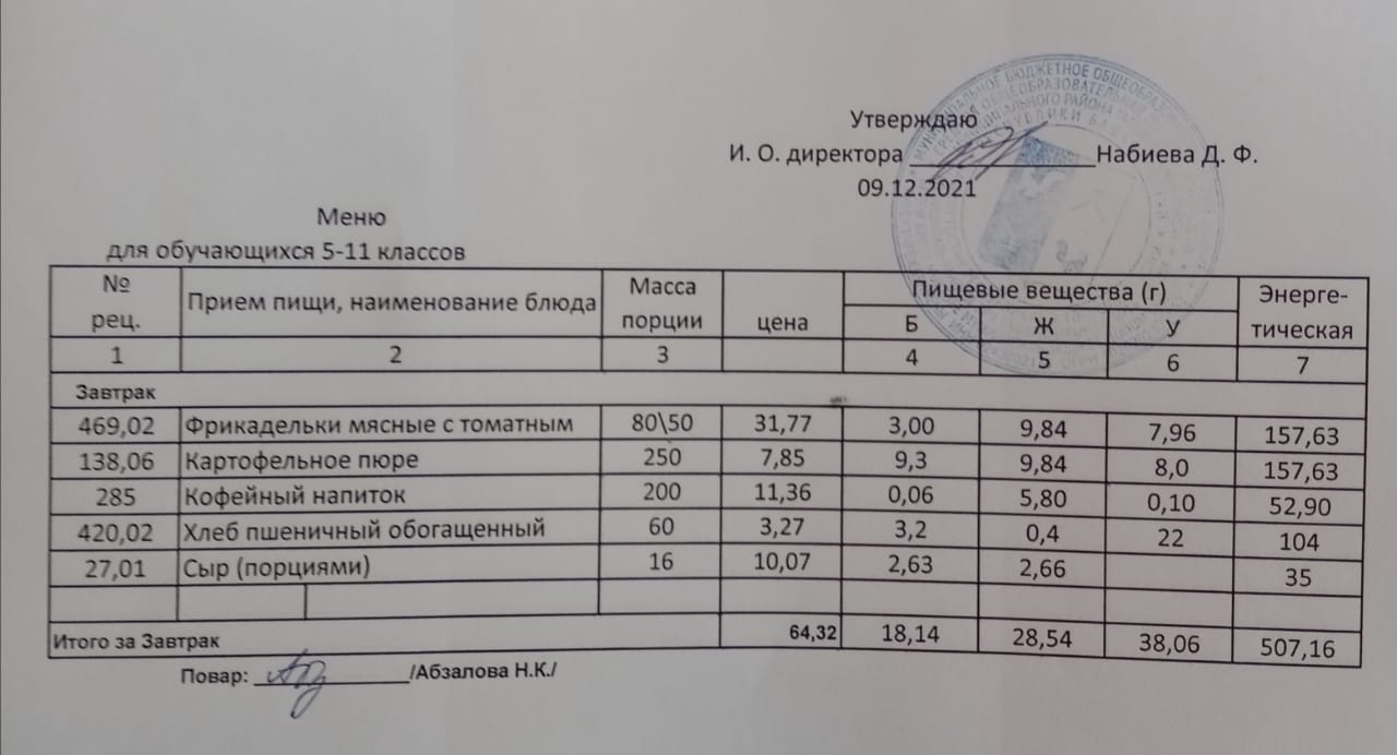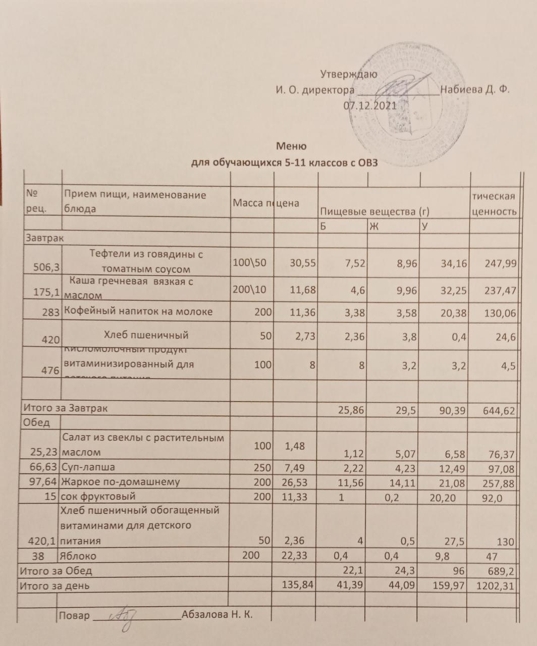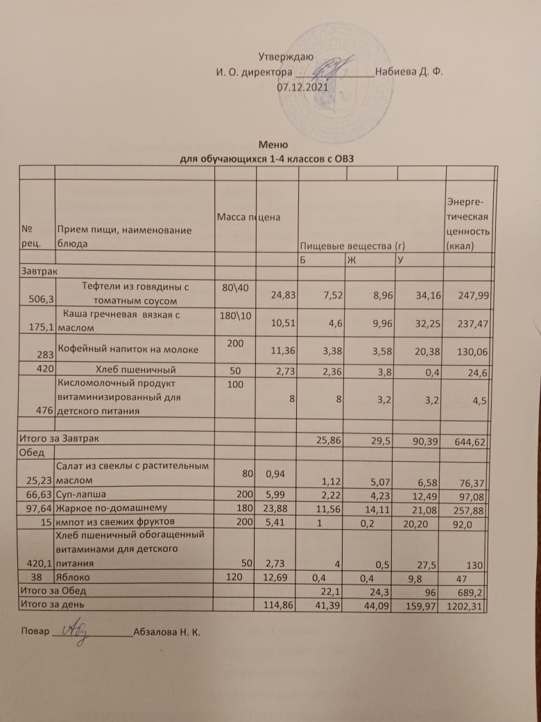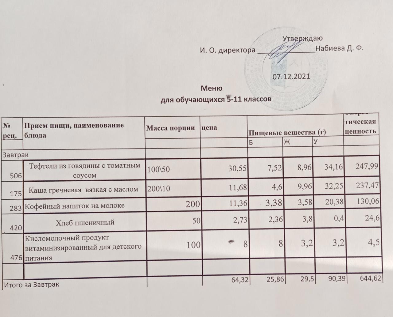 Меню на 07.12. для учащихся из ММС