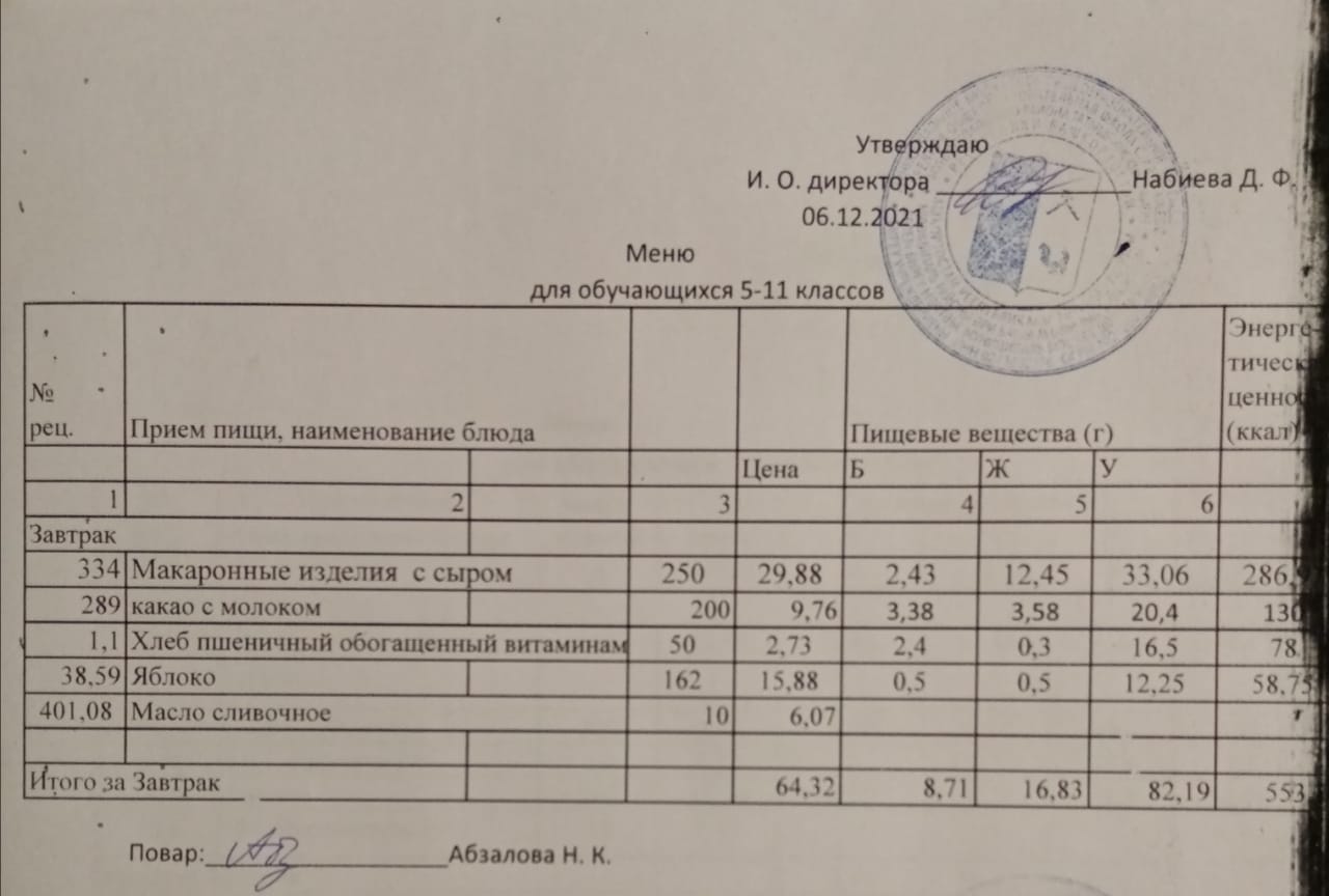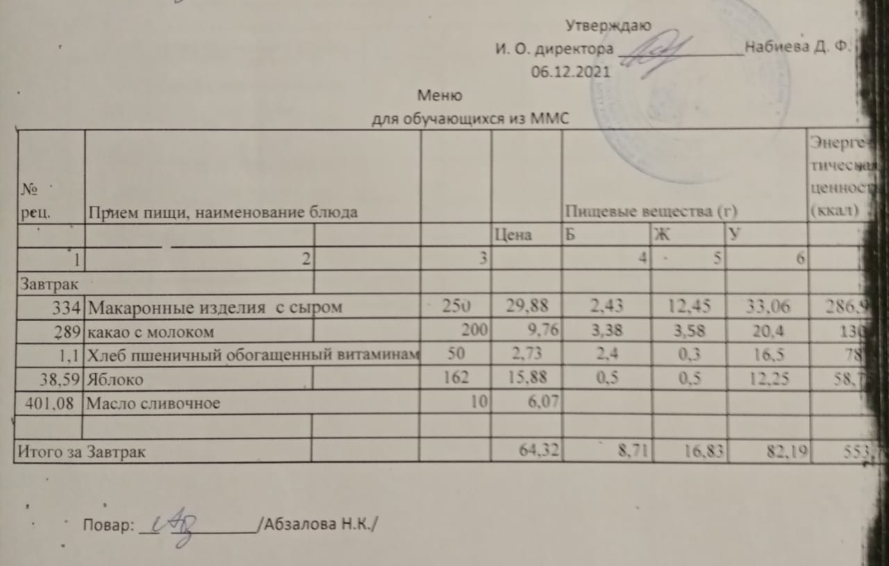Меню на 06.12. для учащихся из ММС