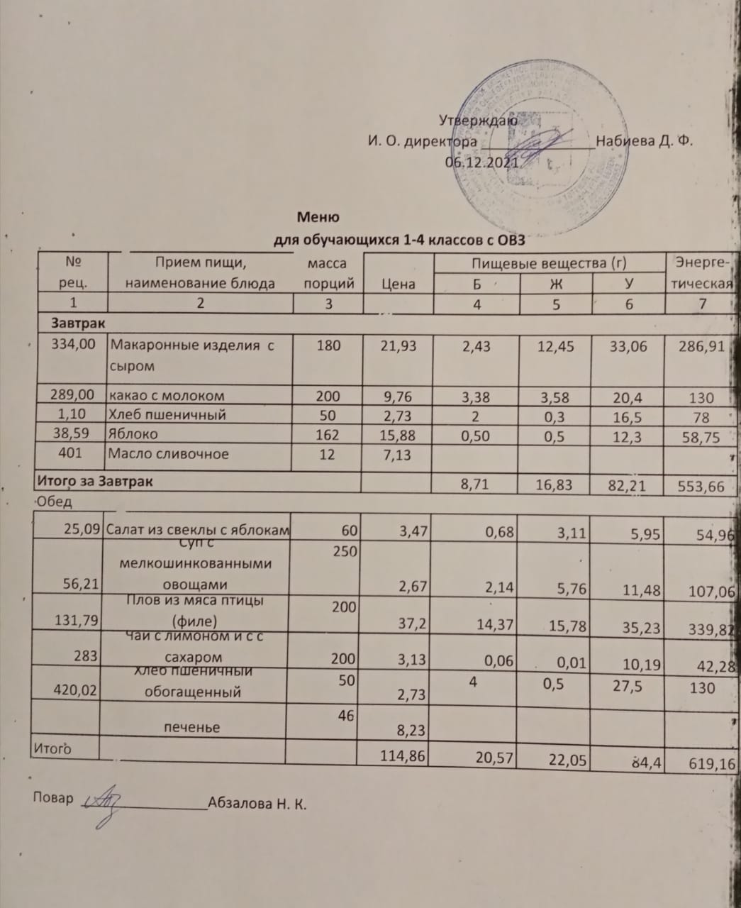 Меню на 06.12. для учащихся 1-4 кл с ОВЗ