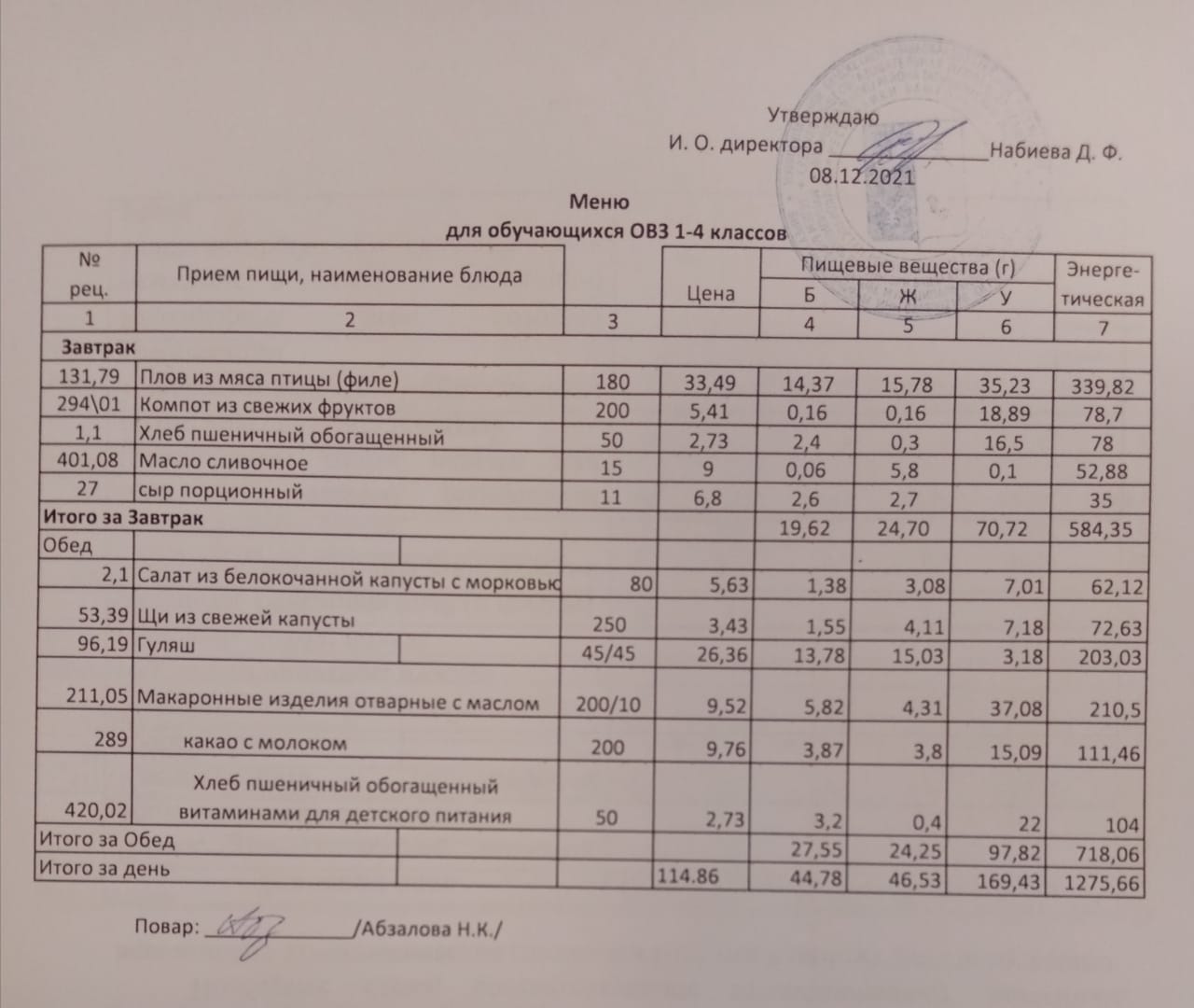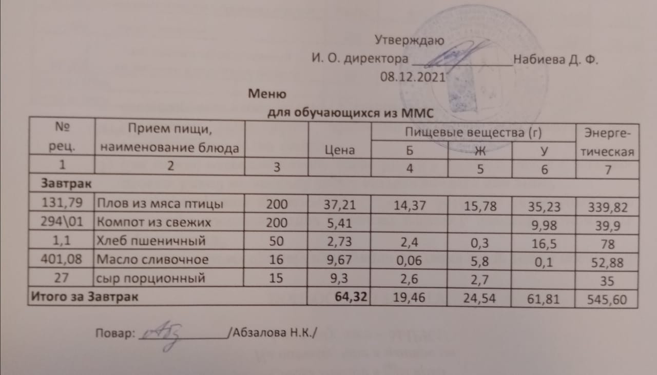 Меню на 08.12. для учащихся из ММС