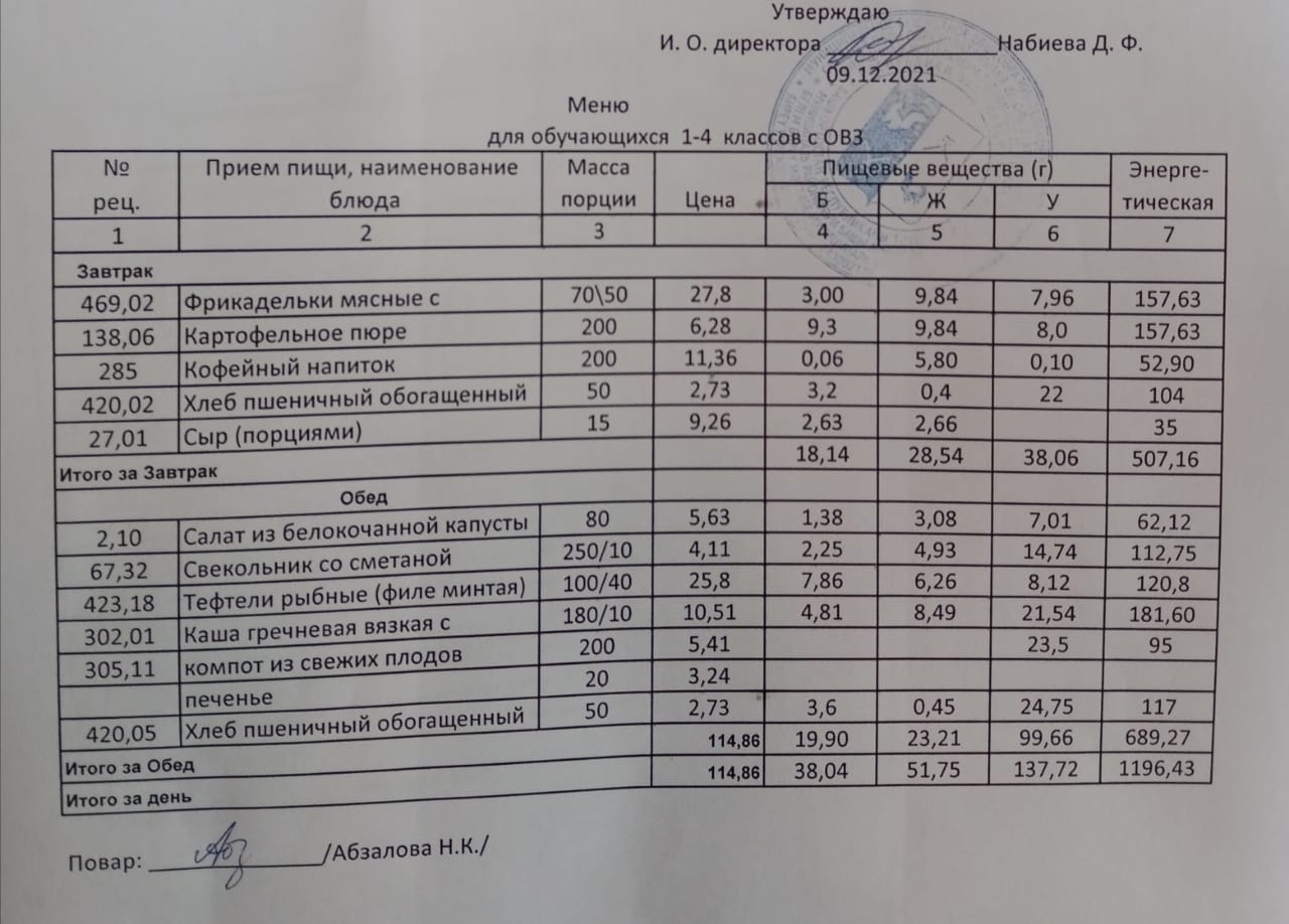Меню на 09.12. для учащихся 1-4 кл с ОВЗ