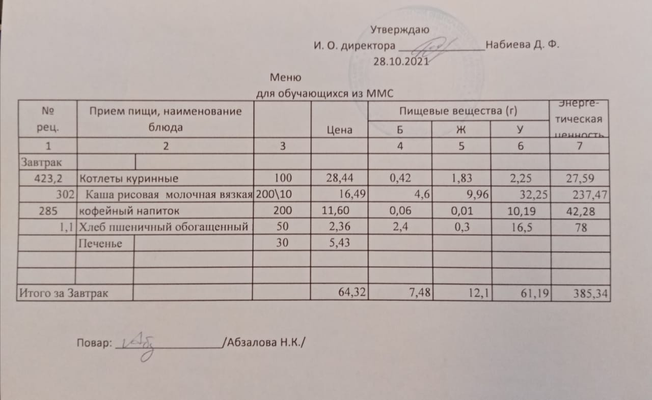 Меню на 28.10. для учащихся из ММС
