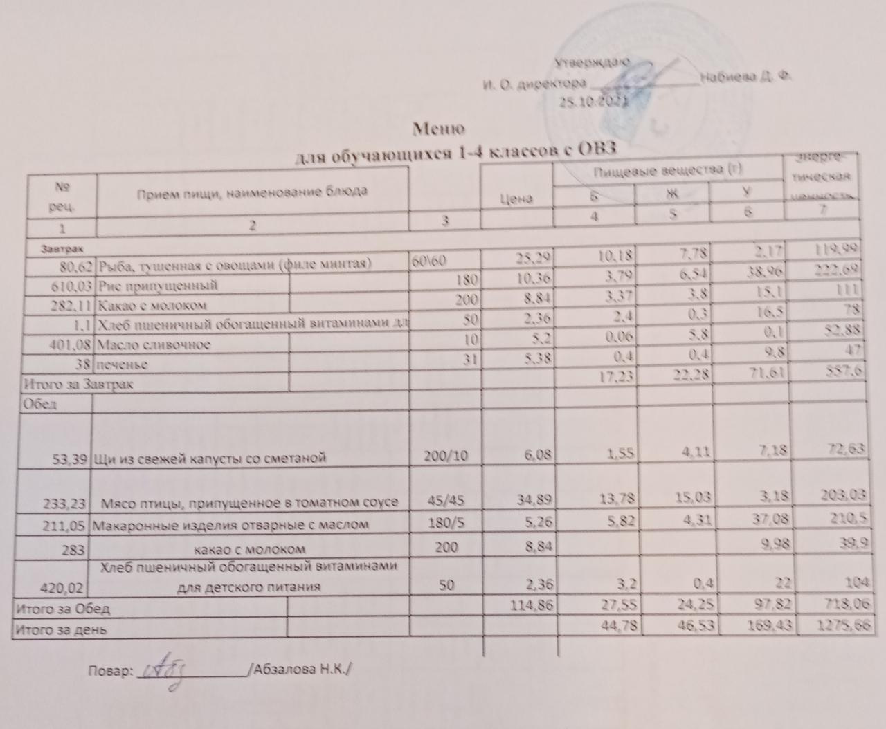 Меню на 25.10. для обучающихся 1-4 кл с ОВЗ