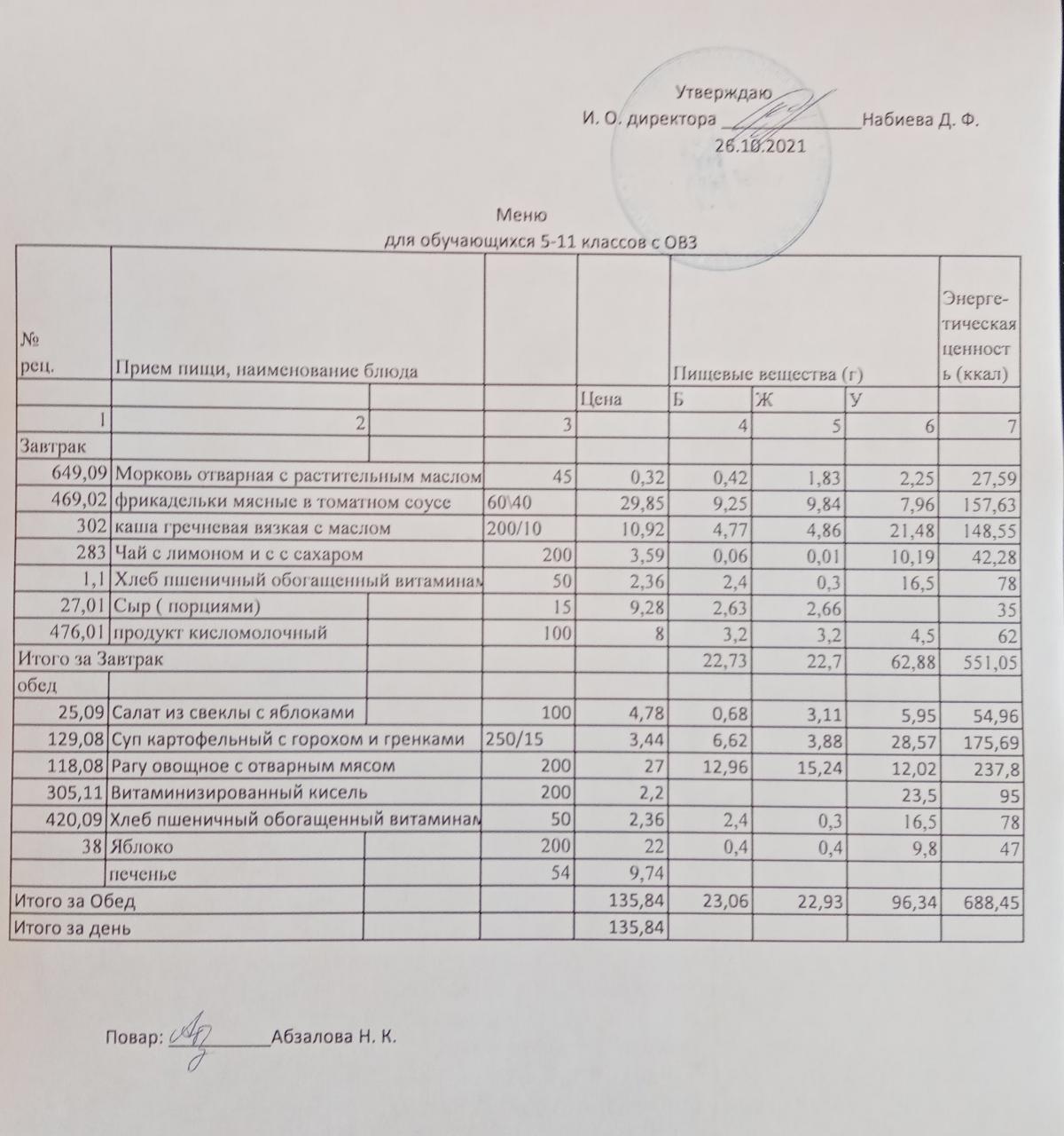 Меню на 26.10. для обучающихся 5-11 кл с ОВЗ