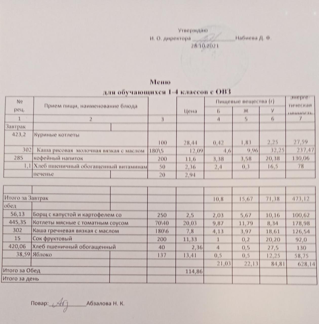 Меню на 28.10. для учащихся 1-4 кл с ОВЗ