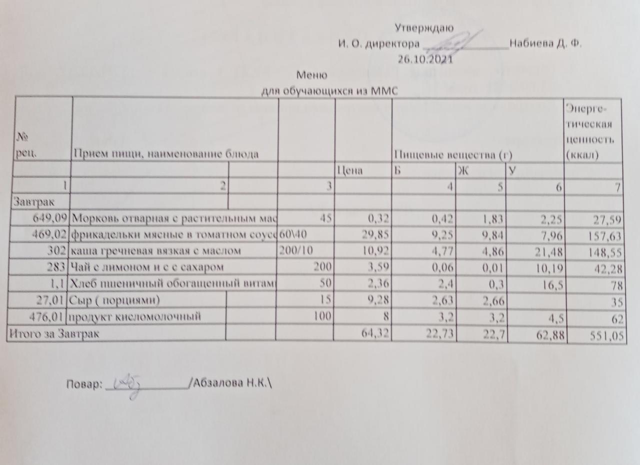 Меню на 26.10. для обучающихся из ММС