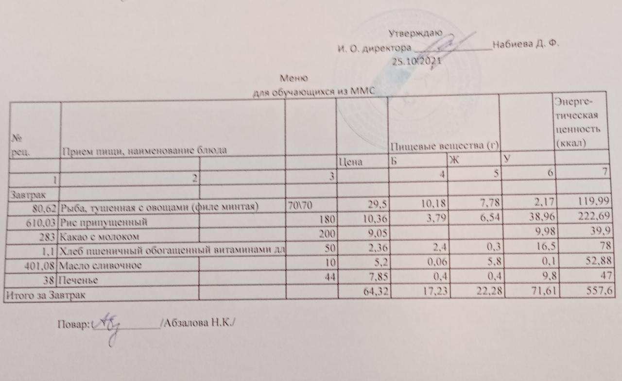 Меню на 25.10. для обучающихся из ММС