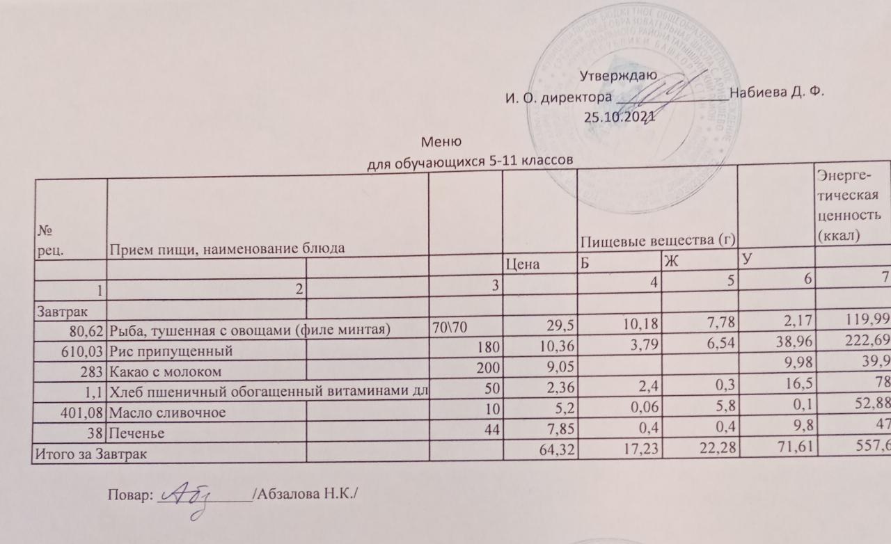 Меню на 25.10. для обучающихся 5-11 кл