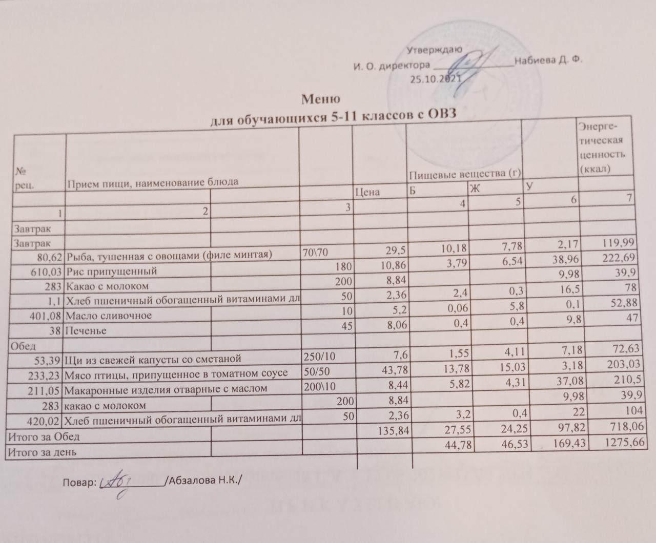 Меню на 25.10. для обучающихся 5-11 кл с ОВЗ