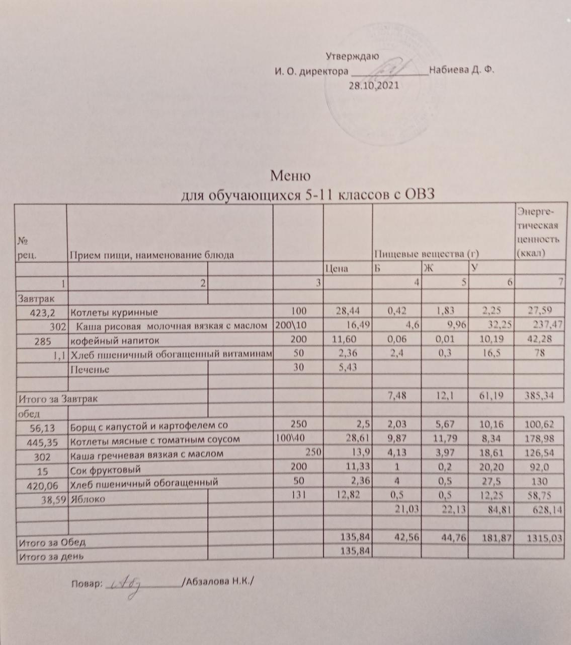 Меню на 28.10. для учащихся 5-11 кл с ОВЗ