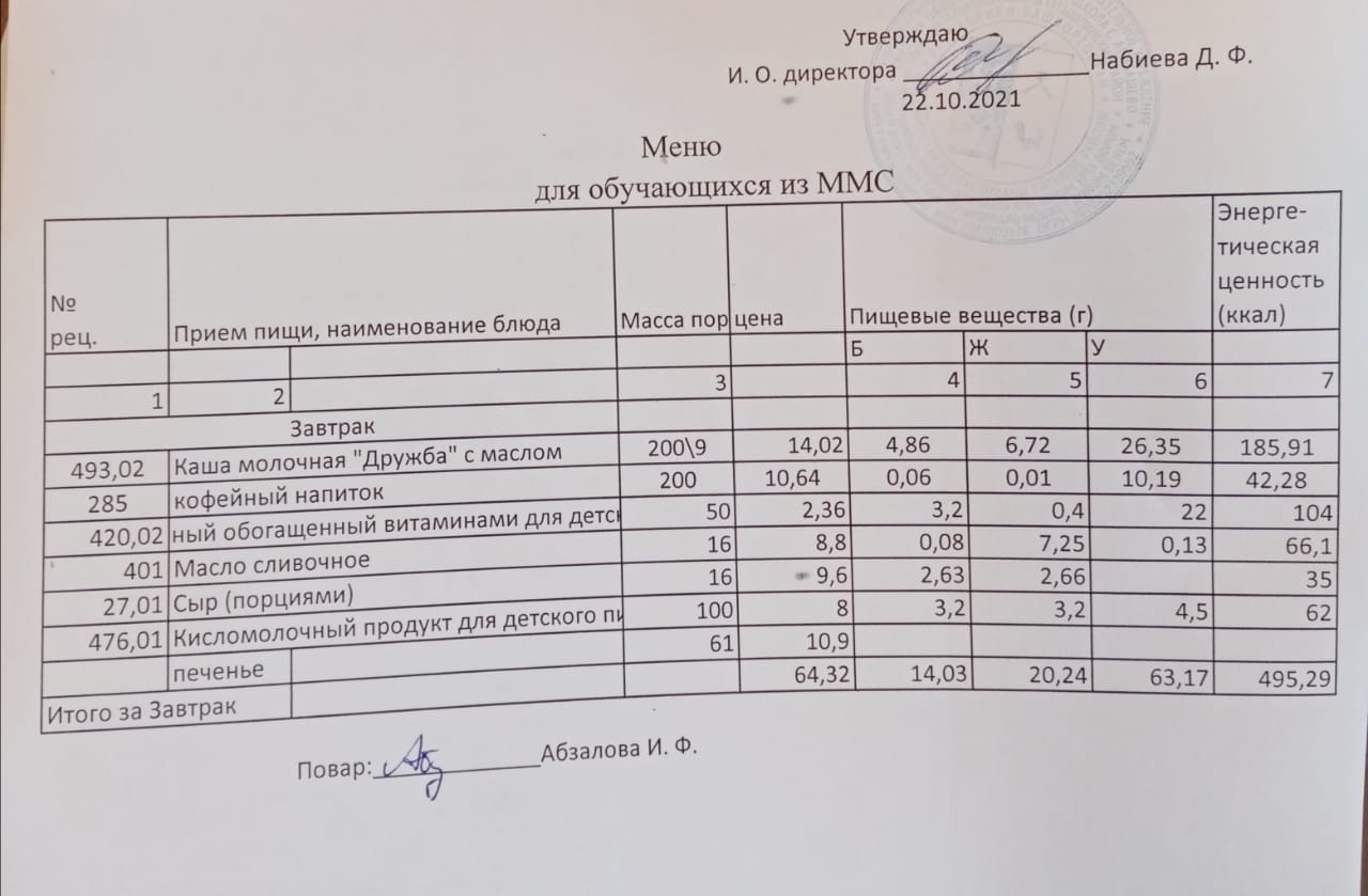 Меню на 22.10. для учащихся из ММС